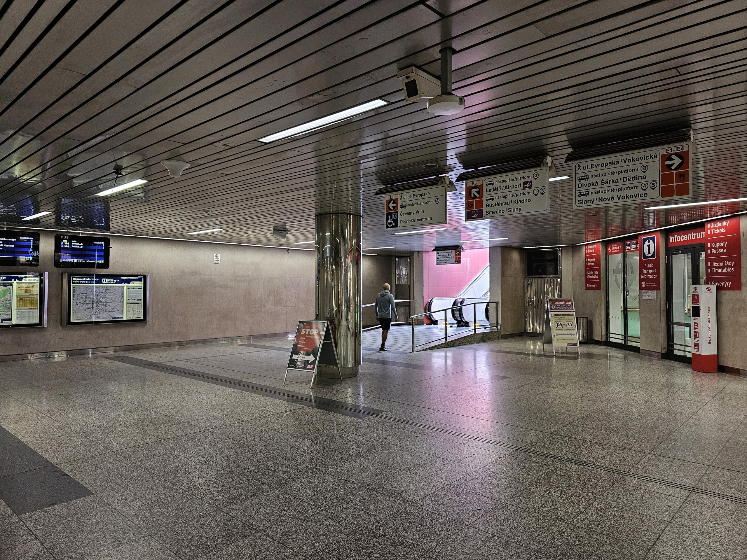 Den siste trolleybussen på linje 59 fra flyplassen går kl. 23.32, med forbindelse til metroen fra Nádraží Veleslavín til sentrum kl. 23.55.