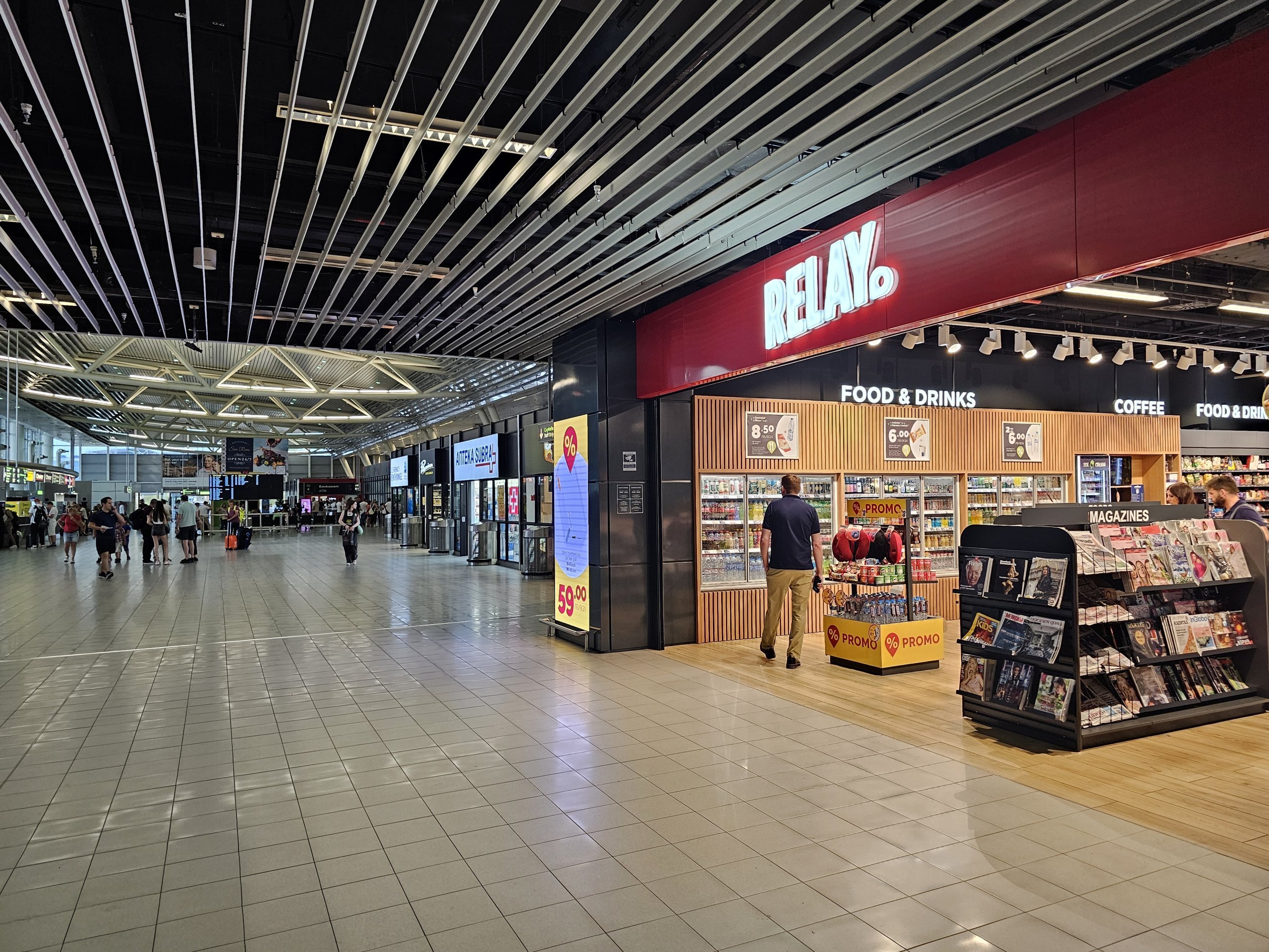 I de offentlige områdene og transittområdene i begge terminalene kan du kjøpe lette forfriskninger i RELAY-kioskene: