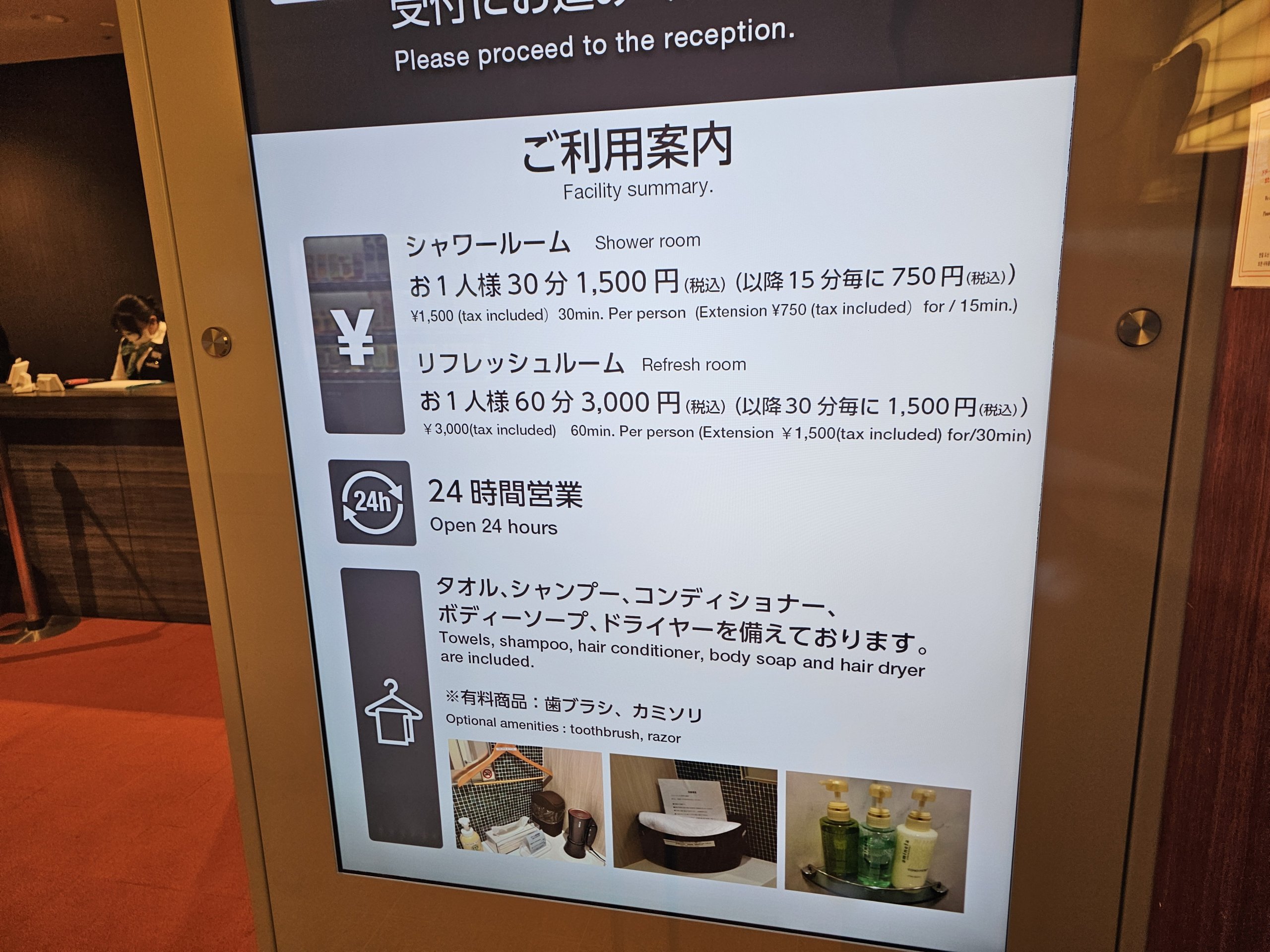- Dusjrom - offentlig område, ankomst 1F, åpent kl. 5.00-10.00/16.00-22.00, gebyr for 30 minutters dusj 1 500 jpy