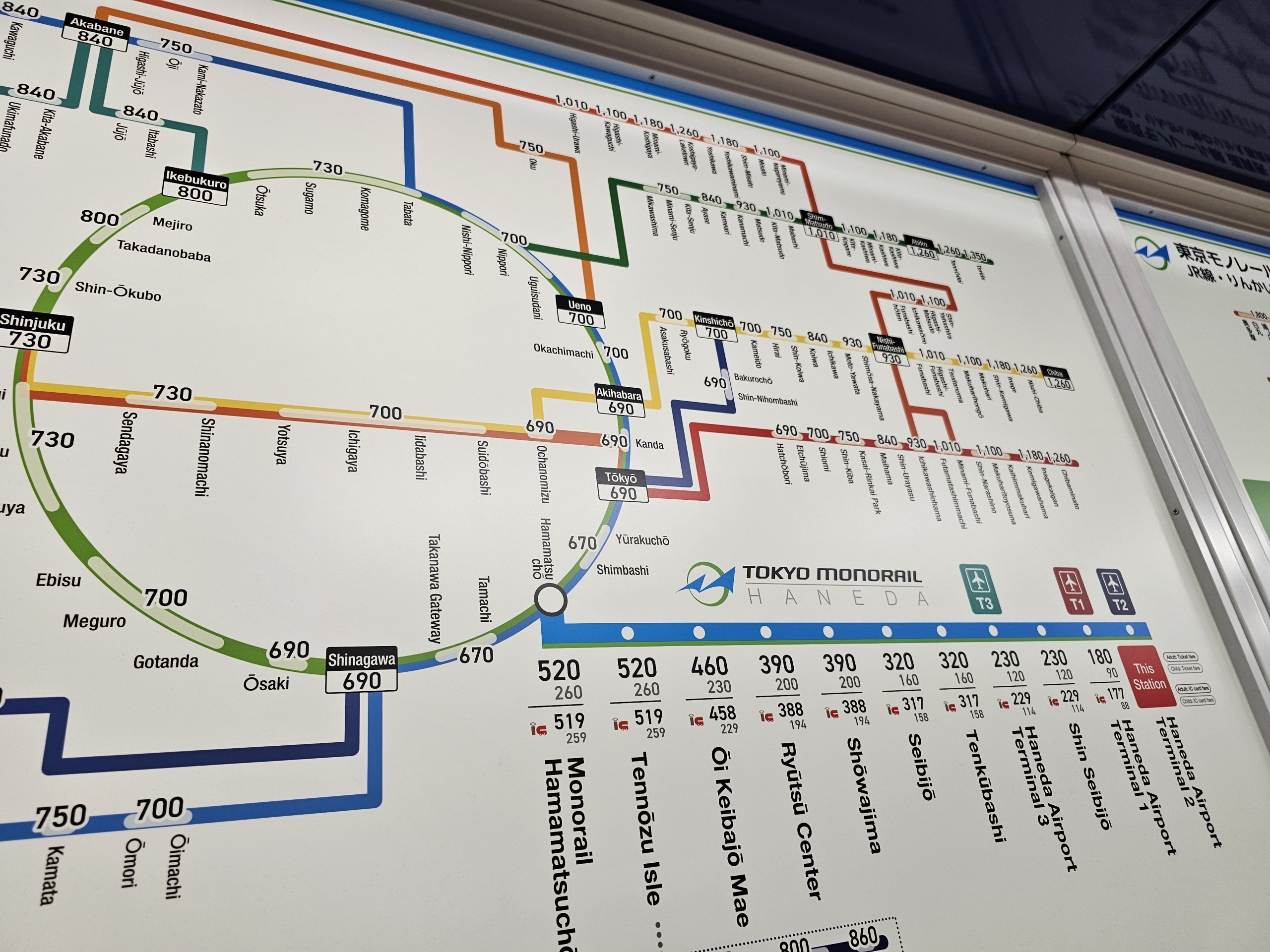 På lørdager, søndager og helligdager må du betale 540 jpy for å reise fra flyplassen til et hvilket som helst sted på Tokyo Monorail eller JR Yamanote Line.
