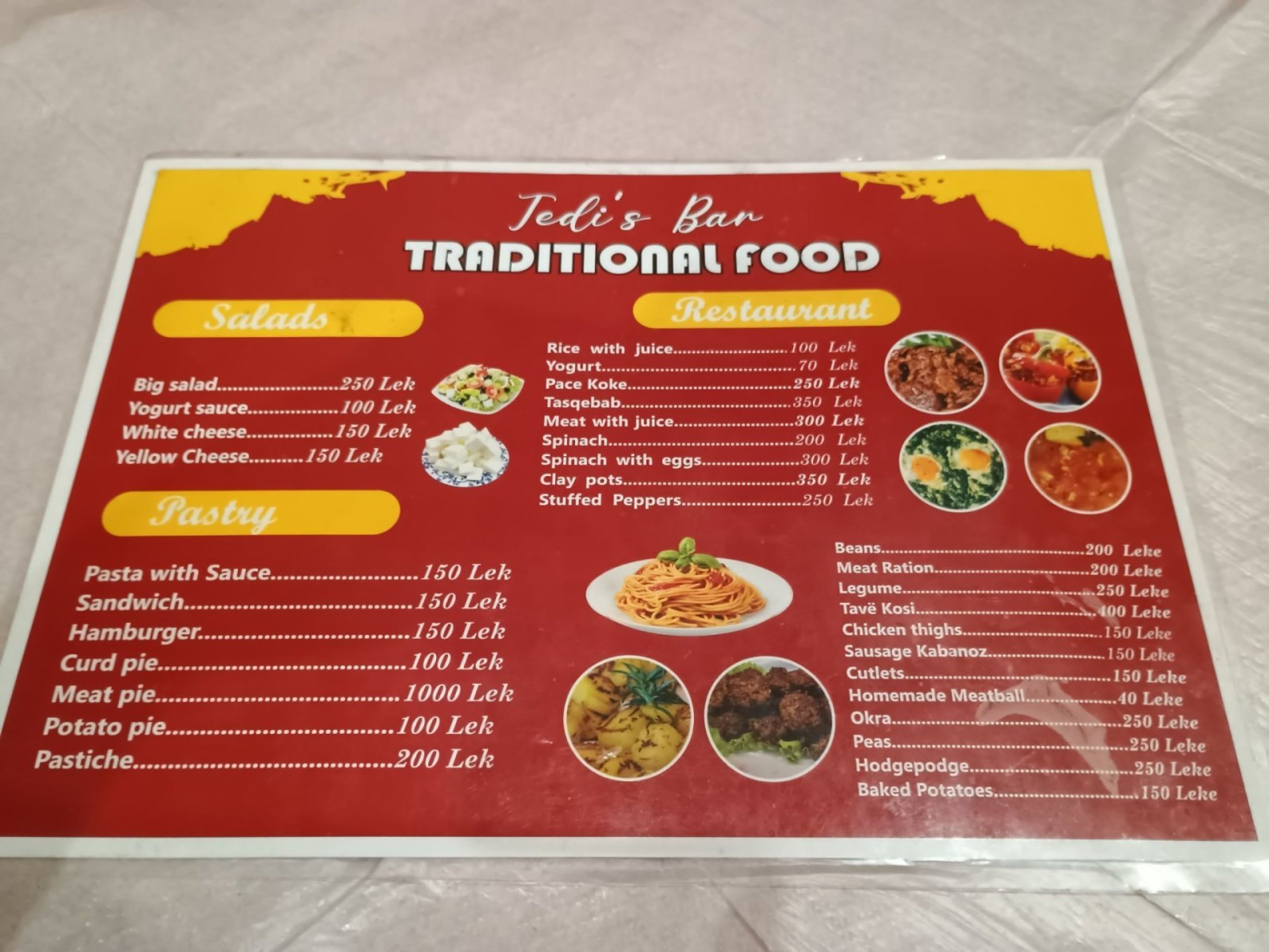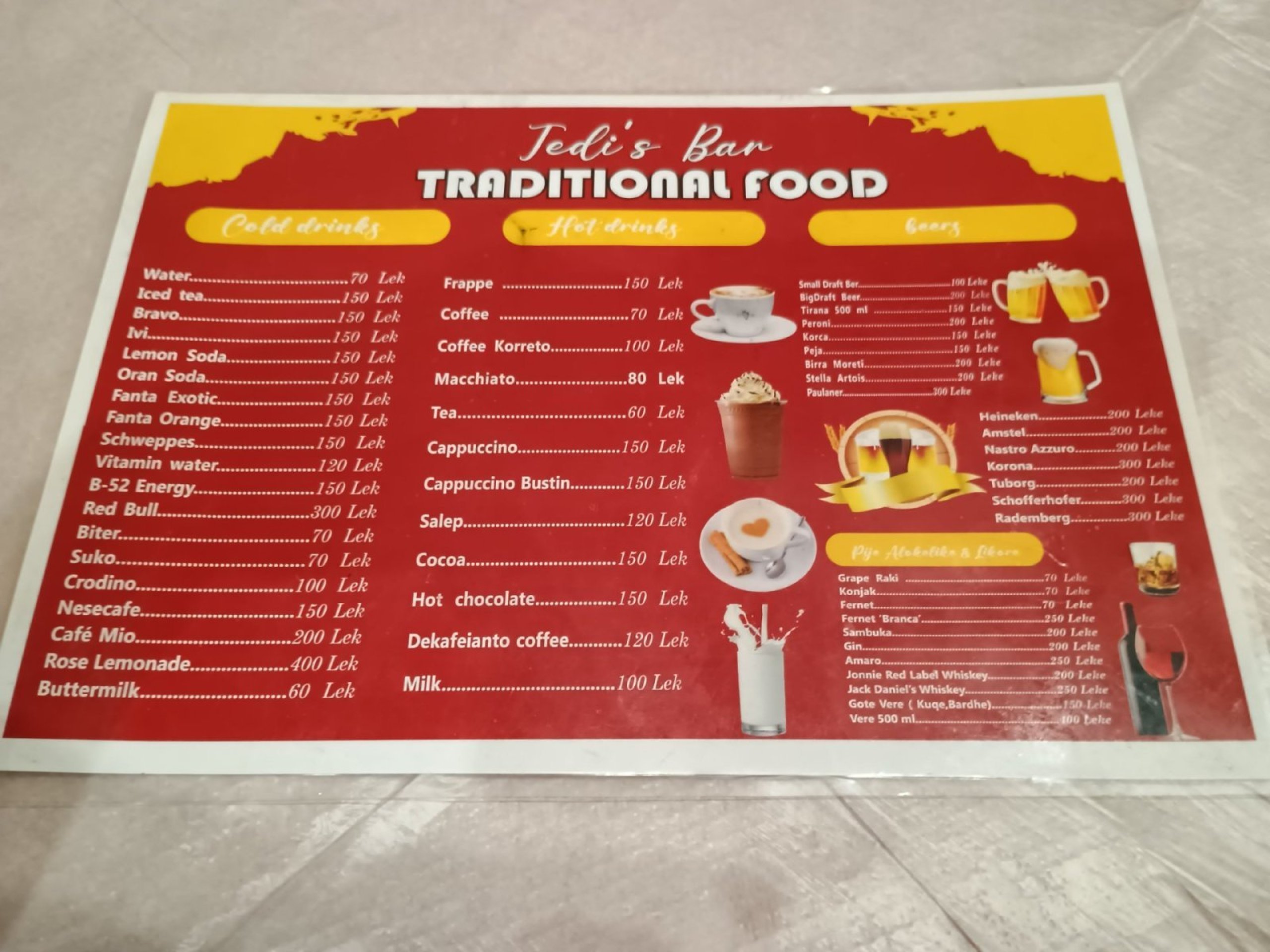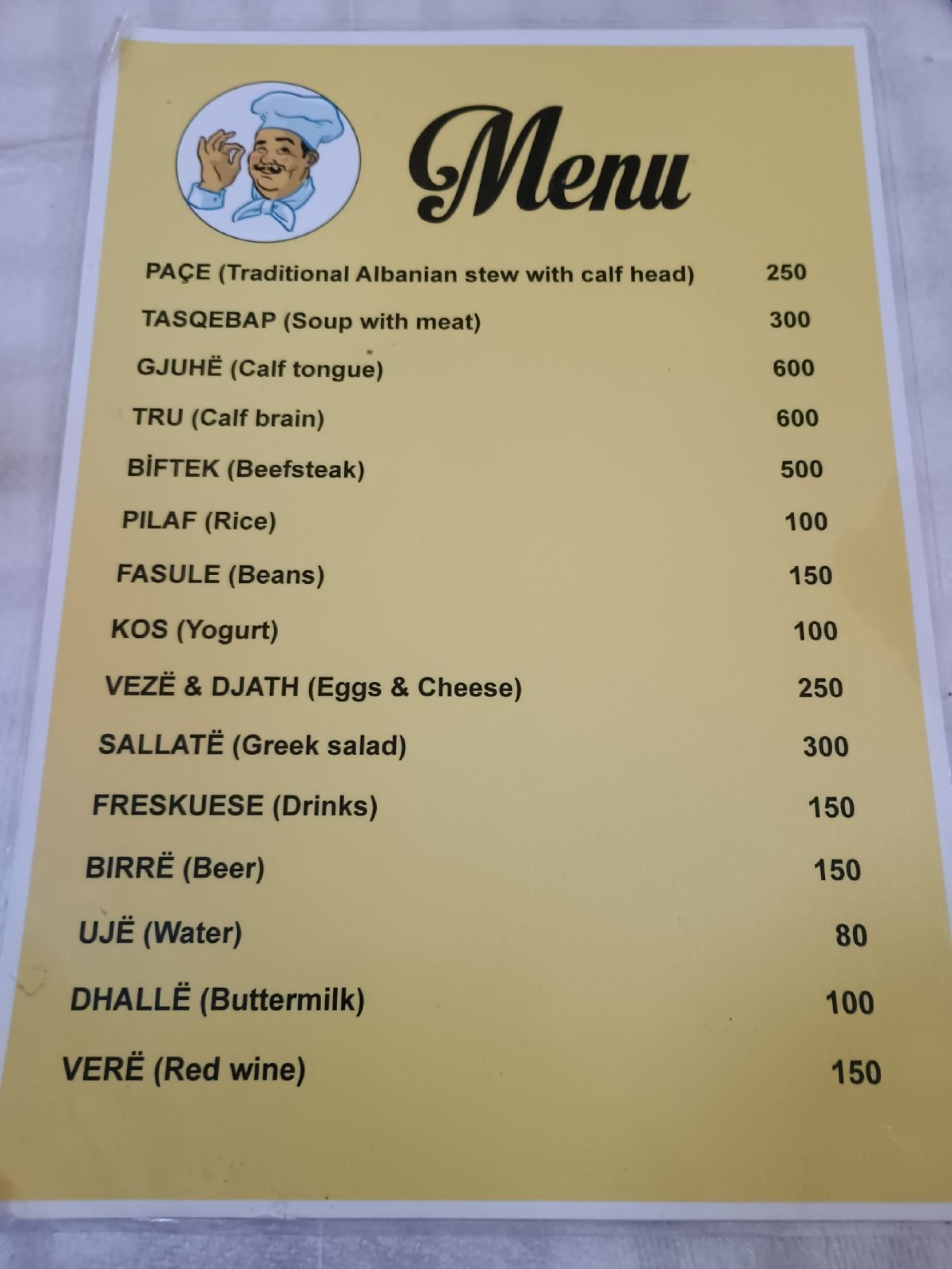 Jeg har lagt ved menyen fra en vanlig albansk ikke-turistrestaurant i nærheten av busstasjonen i Drača og markedet i Tirana - ganske stor forskjell sammenlignet med prisene på restauranter på turiststeder.