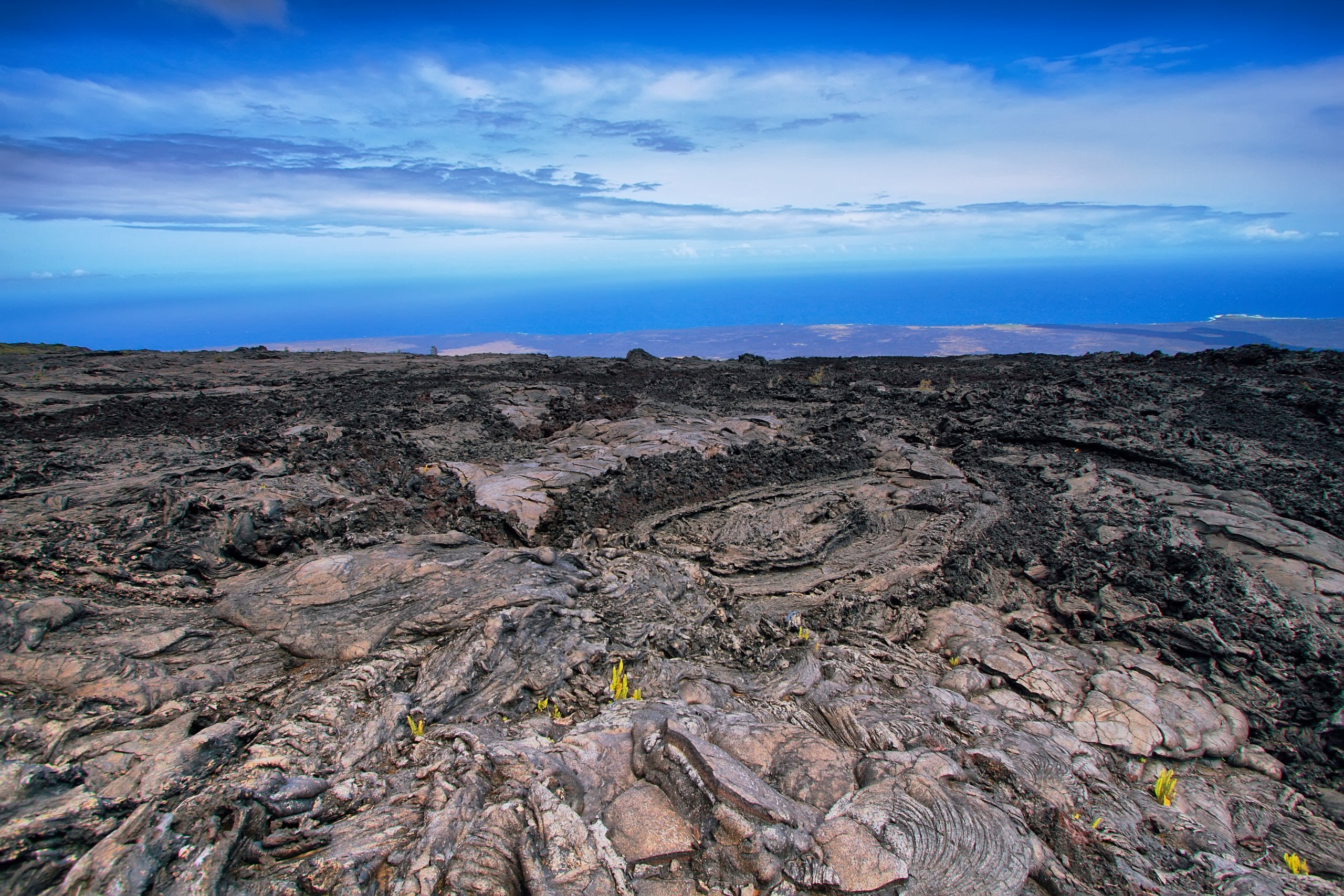 Langs kysten ligger et smalt lavlandsområde med tørkede lavafelt og vegetasjon som vokser gjennom horder av svart lava og det endeløse Stillehavet. I bakgrunnen kan du tydelig se den hvite røyken fra den fortsatt levende lavaen som kommer ut i havet.