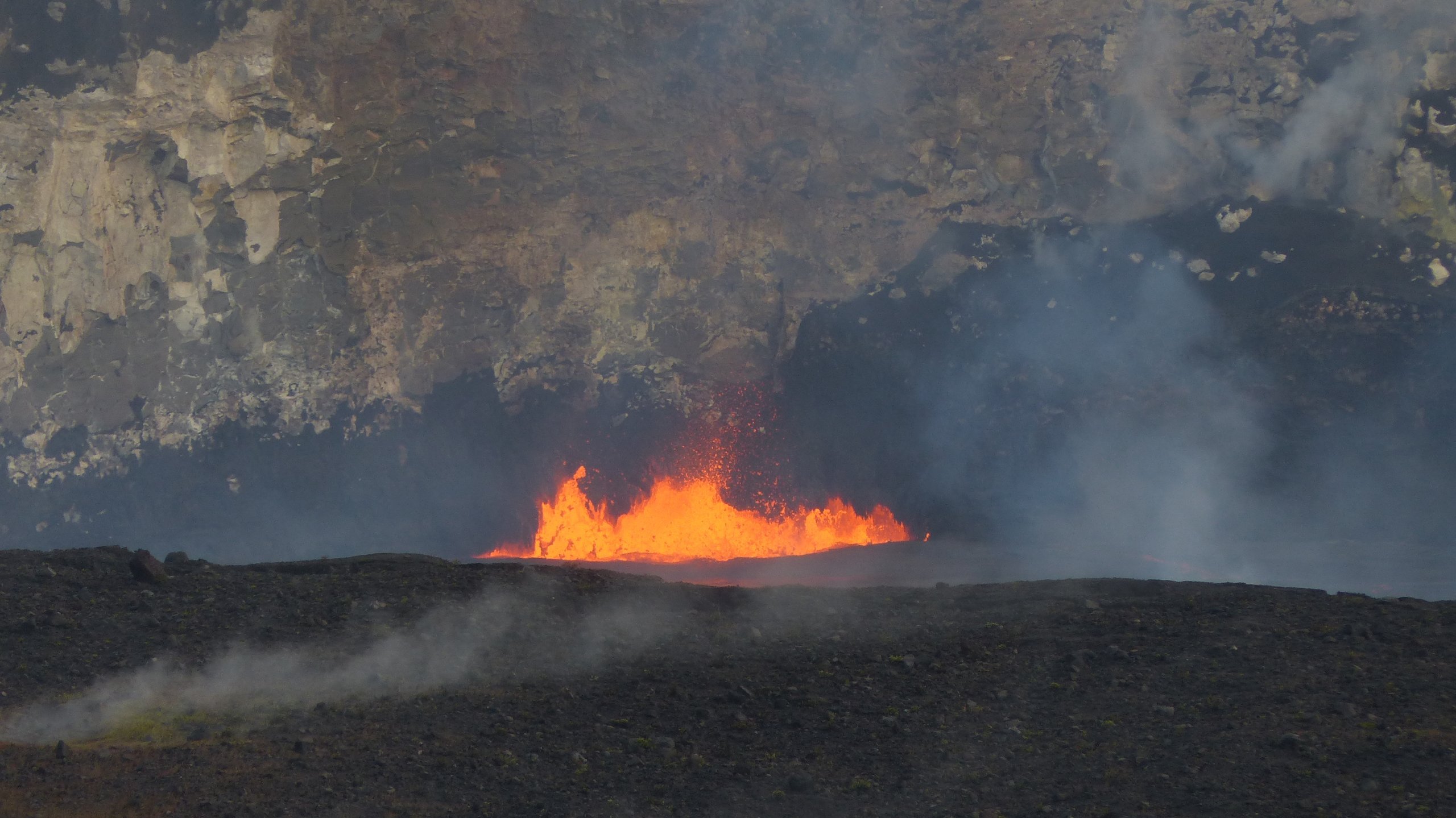 Fra det brede observasjonsdekket har man en overjordisk utsikt over den store, svarte sletten, der det i midten er et lite krater med konstant kokende lava som kan ses 365 dager i året, 24 timer i døgnet.