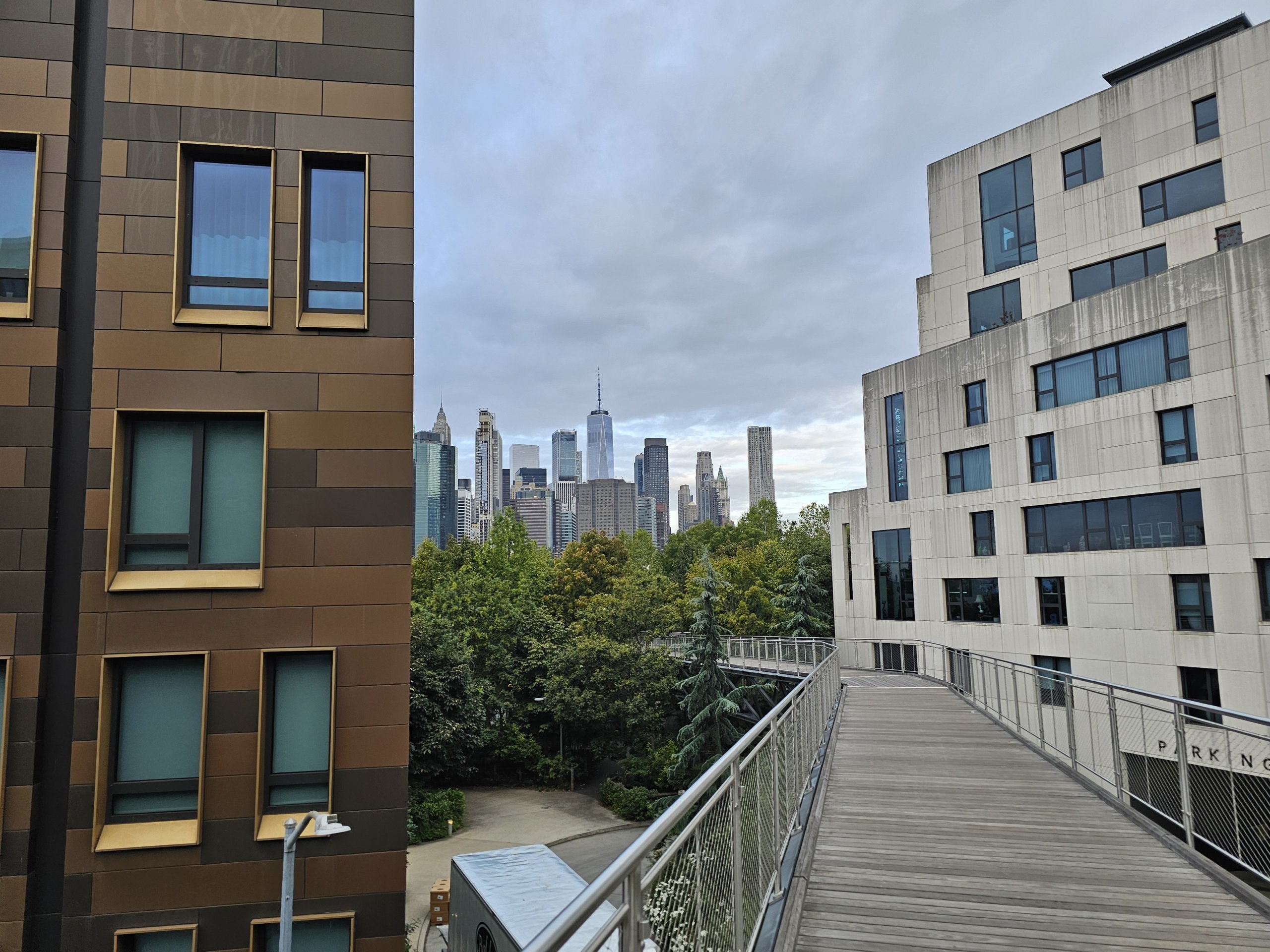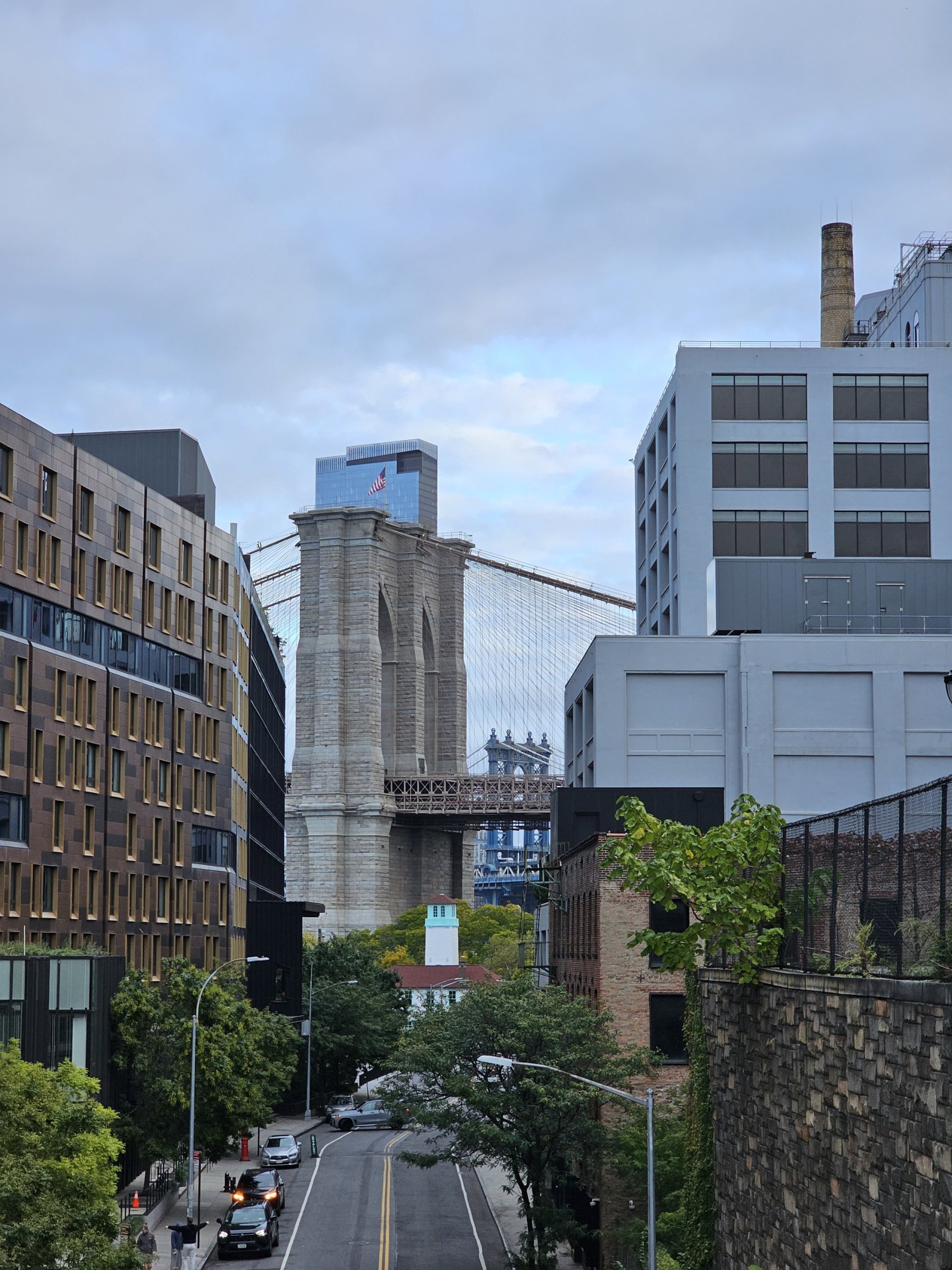 Fra den korte gangbroen i Squibb Park, som ligger rett ved siden av Brooklyn Bridge Park, har du ikke bare en interessant utsikt over det fjerne Manhattan, men også over en av Brooklyn Bridge-pylonene.