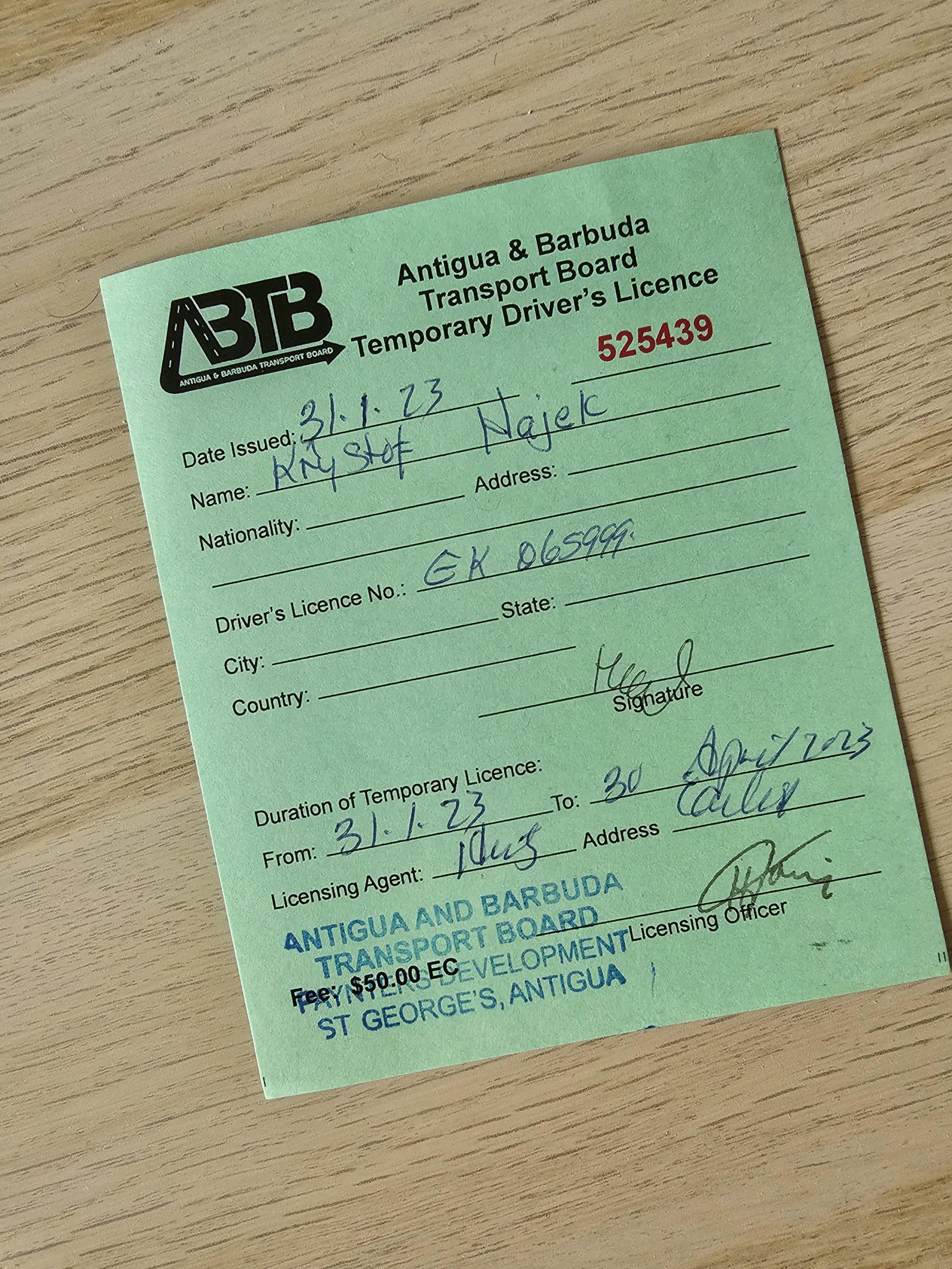 I tillegg må du betale et gebyr på 20 usd / 50 xcd for et midlertidig lokalt førerkort, som vil bli utstedt til deg direkte av bilutleiefirmaet på stedet i form av et håndskrevet grønt papir.