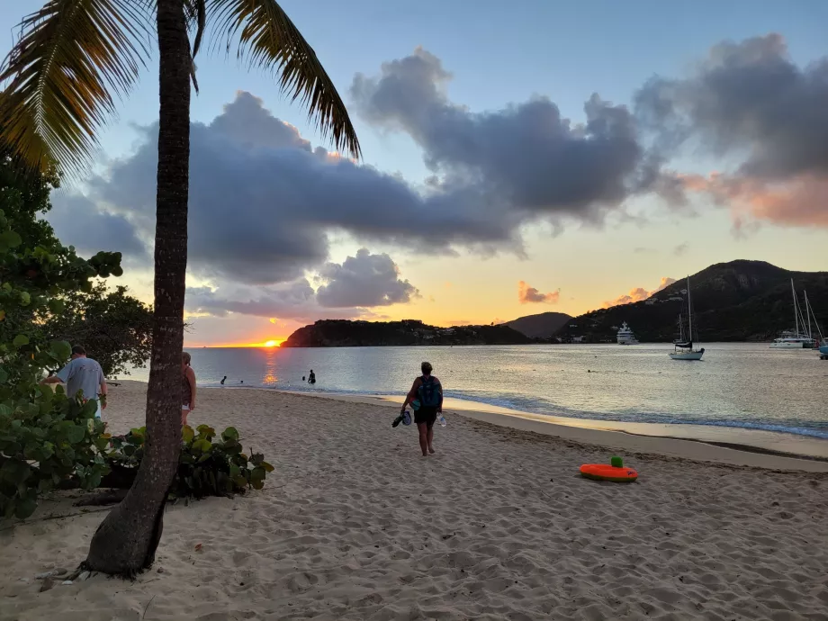 Pigeon Point Beach er et populært sted for å se på de fantastiske solnedgangene, som her går nesten nøyaktig over horisonten over den smale inngangen til bukten og naboøya Montserrat.