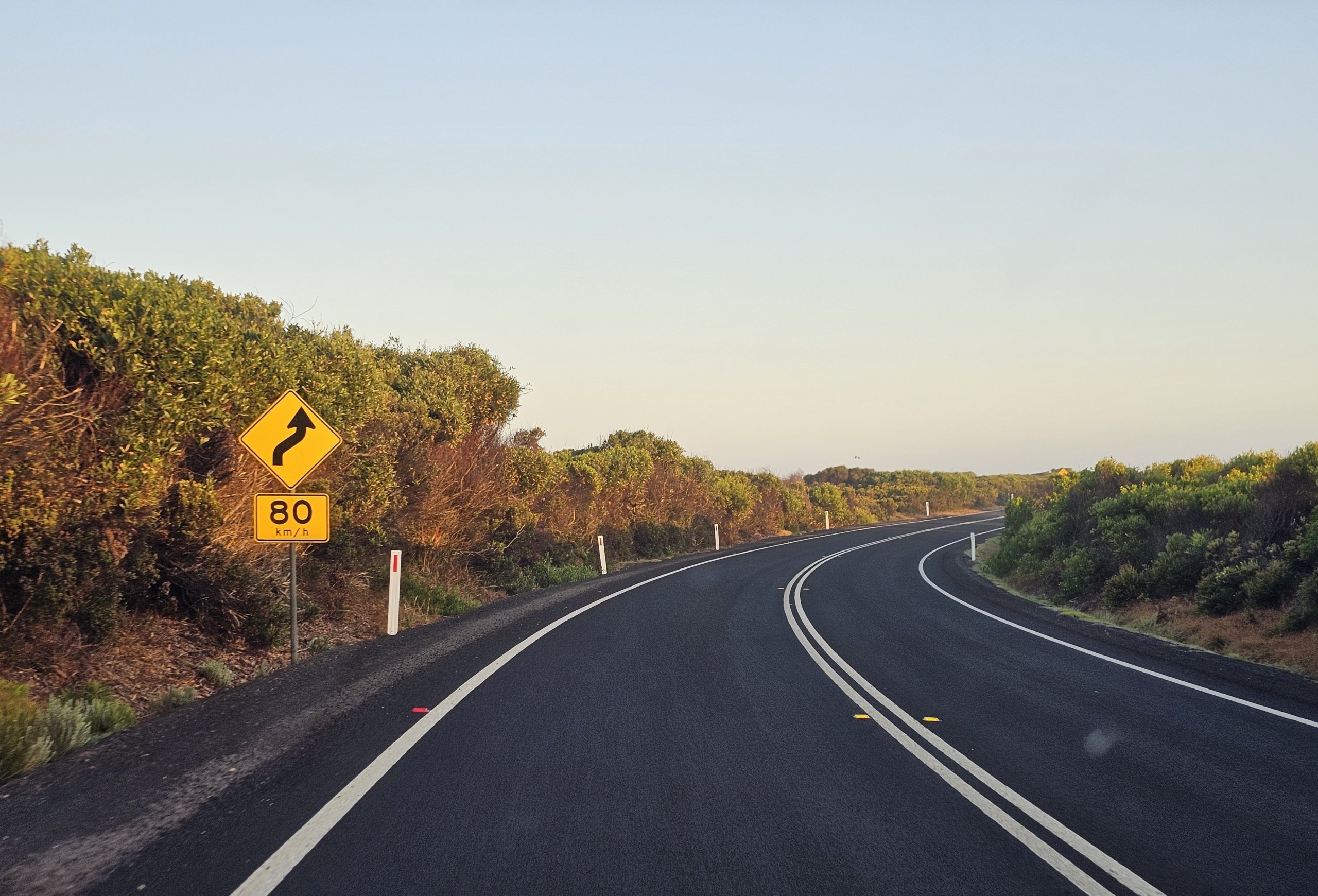 Kvaliteten på veiene langs Great Ocean Road er utmerket. Hovedveiene er godt skiltet, med langsgående oppmerking, gode kantlinjer og svært nyttige fartsveiledningsskilt før hver sving.