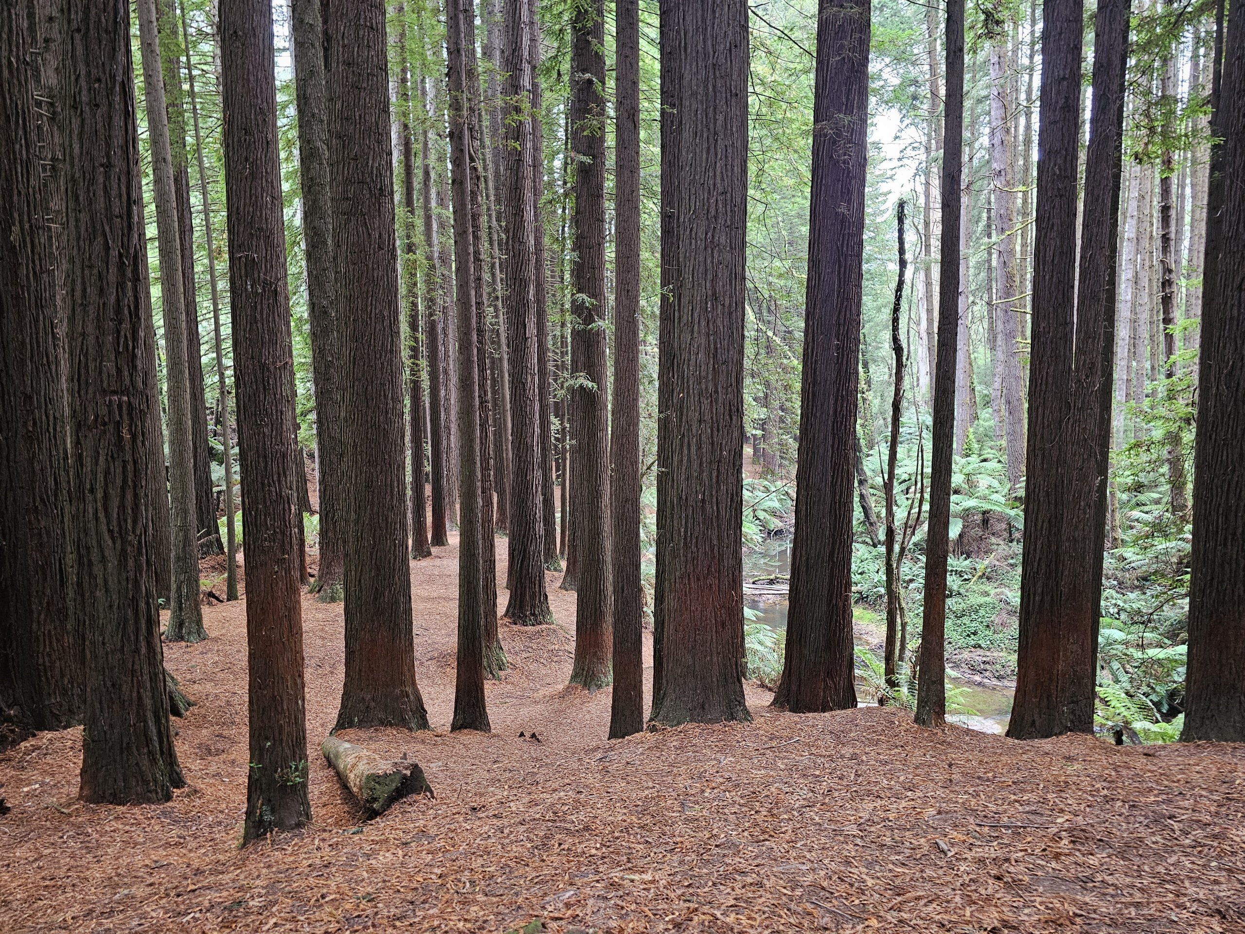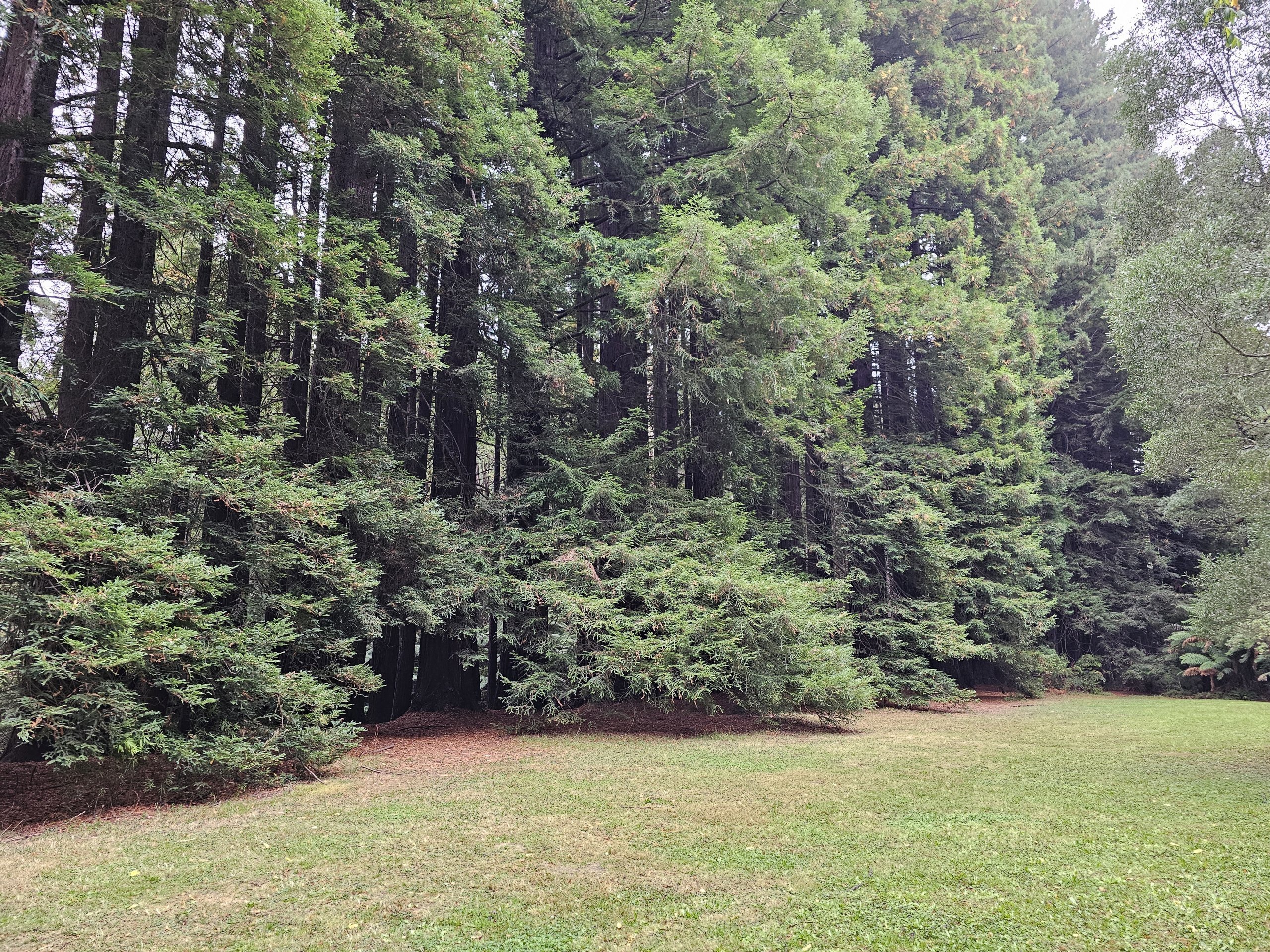 Californisk redwood ble plantet her av lokale bønder som en forsøksskog i 1936.