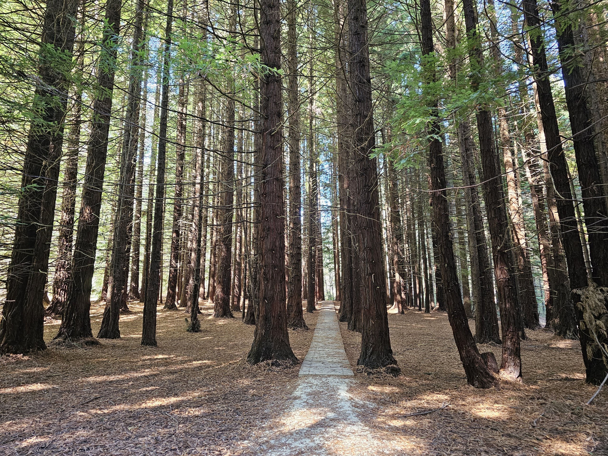 En 400 meter lang tursti fører til fossen gjennom et vakkert landskap med anlagte enger, redwood- og granlunder.