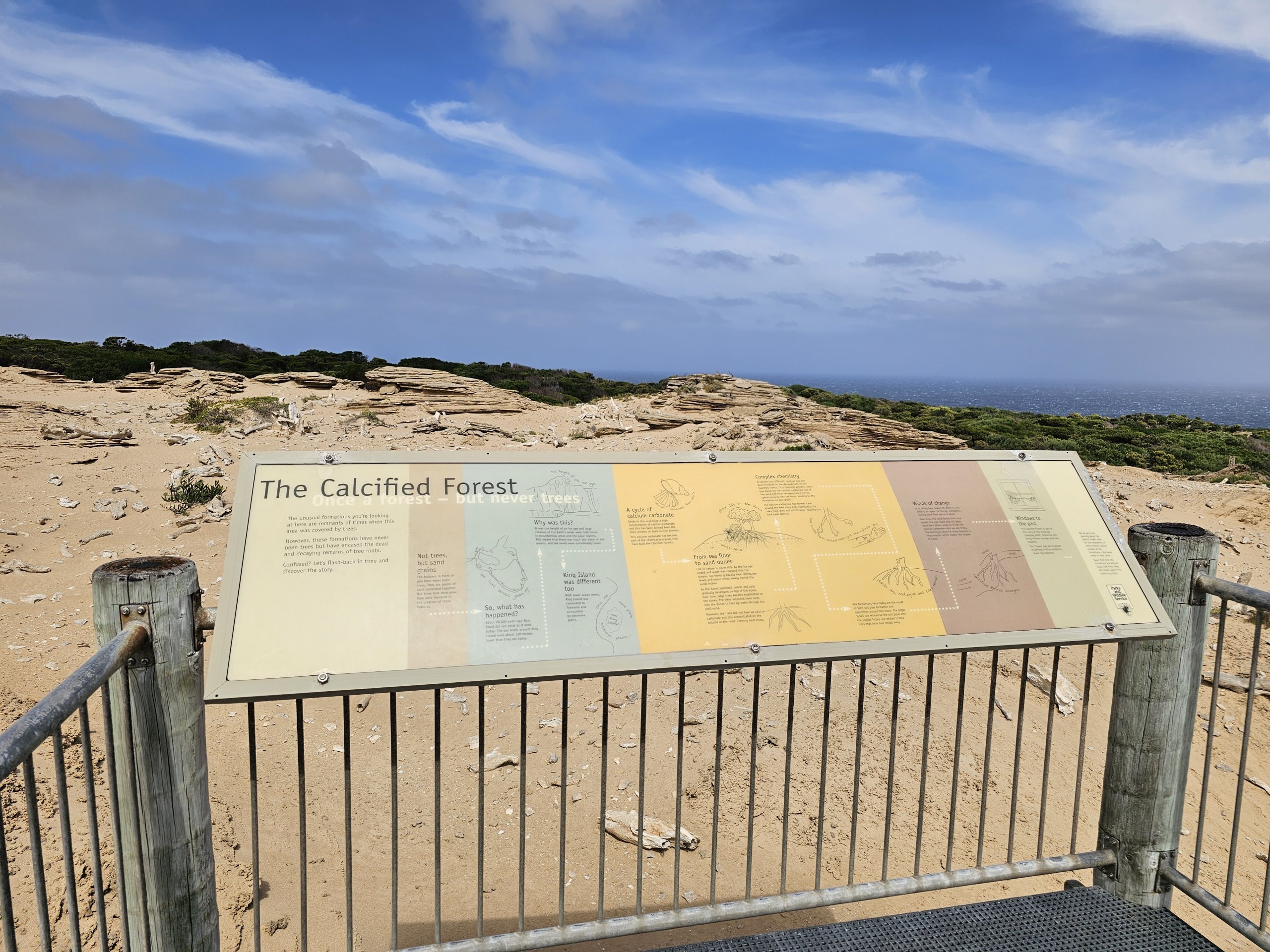 Kalksteinen som utgjør klippene på King Island har gradvis festet seg til røttene til døde og råtnende trær, og i årenes løp har sterk vind blottlagt og synliggjort disse røttene.