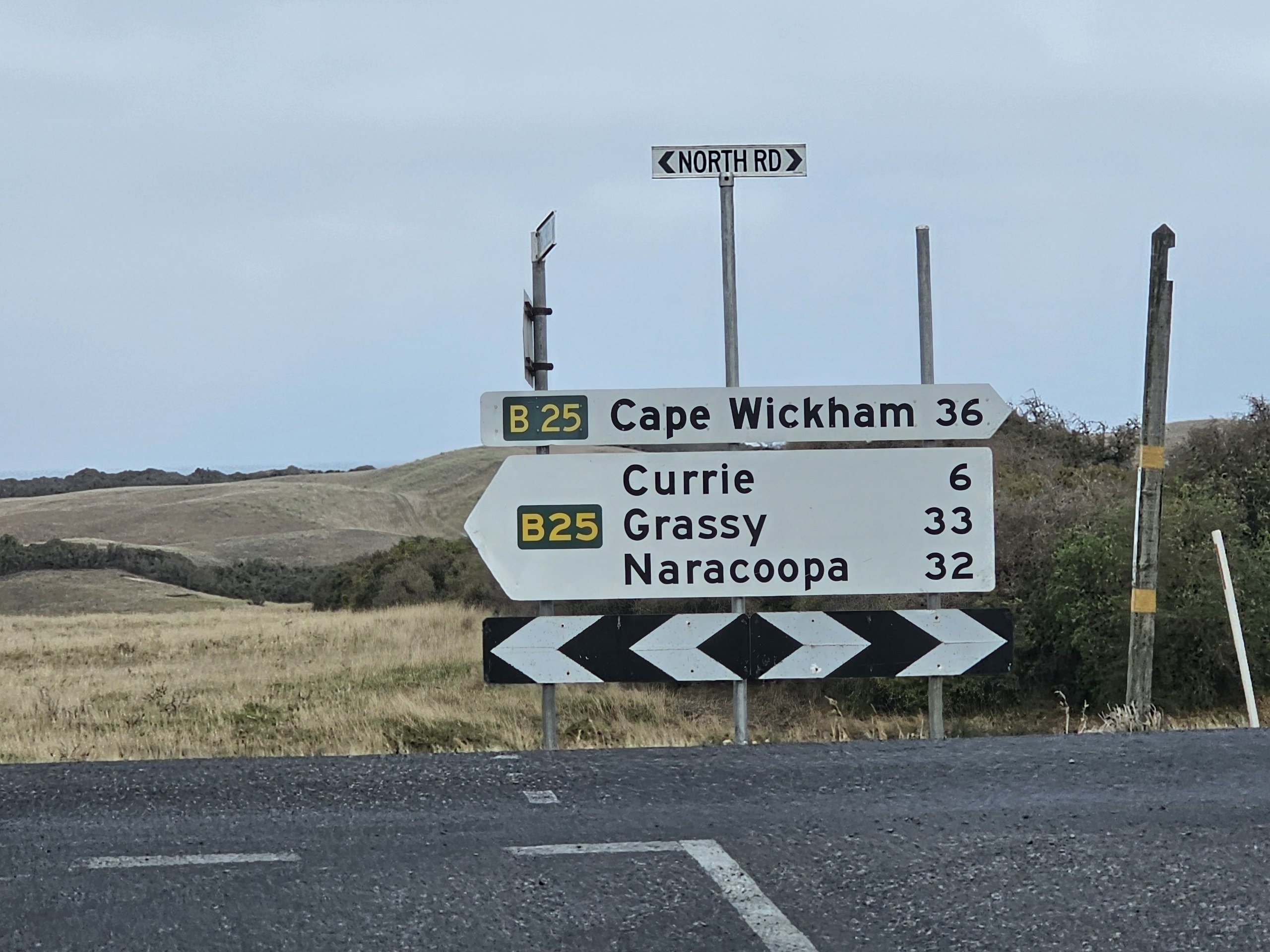 Hovedveiene til flyplassen og fra Currie til Cape Wickham Lighthouse, Grassy og Naracoopa er asfalterte og godt skiltet.