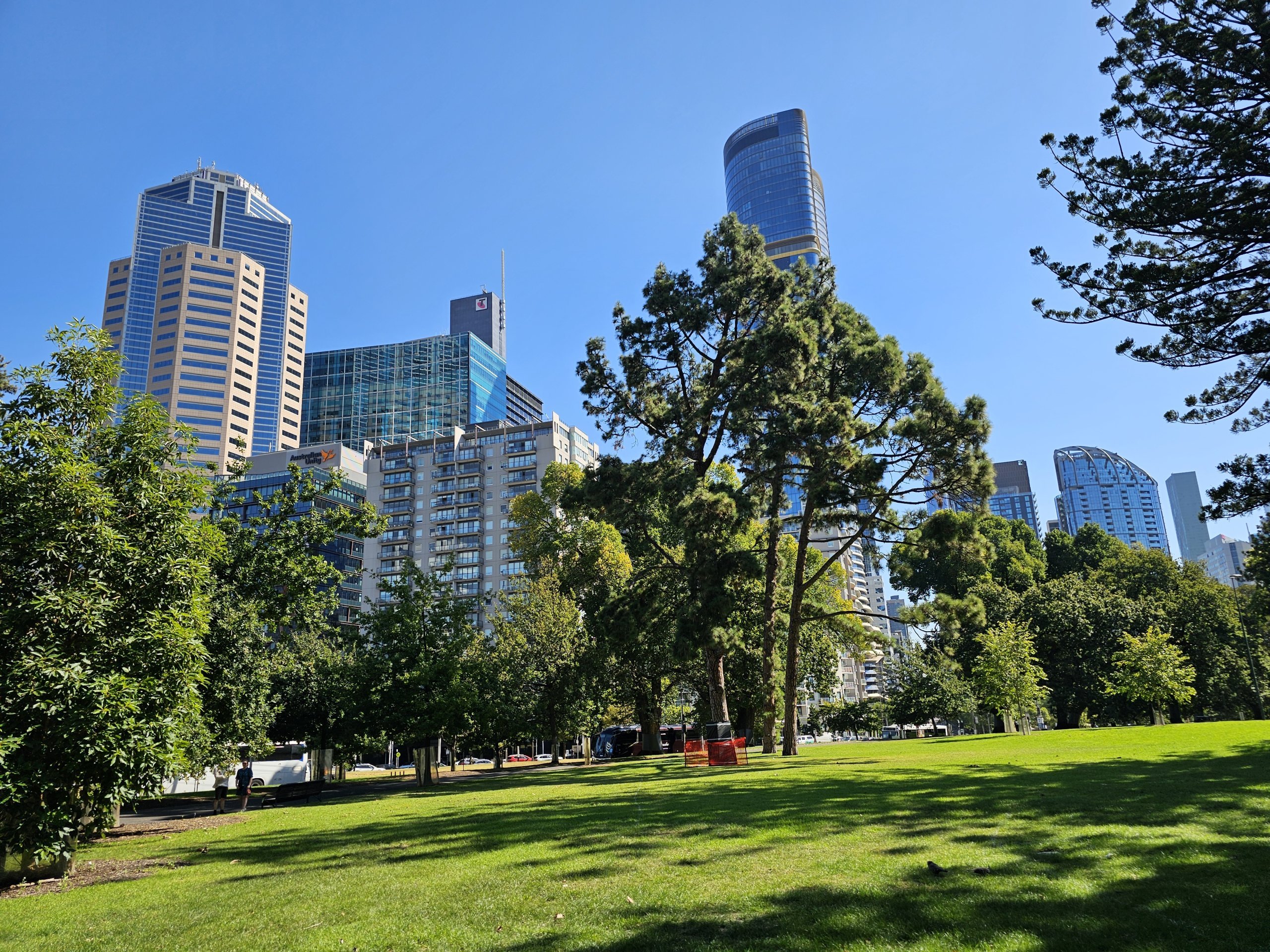 Mellom Royal Exhibition Building og hovedgaten Victoria Street ligger Carlton Gardens, en vakker park med en fontene og mange benker.