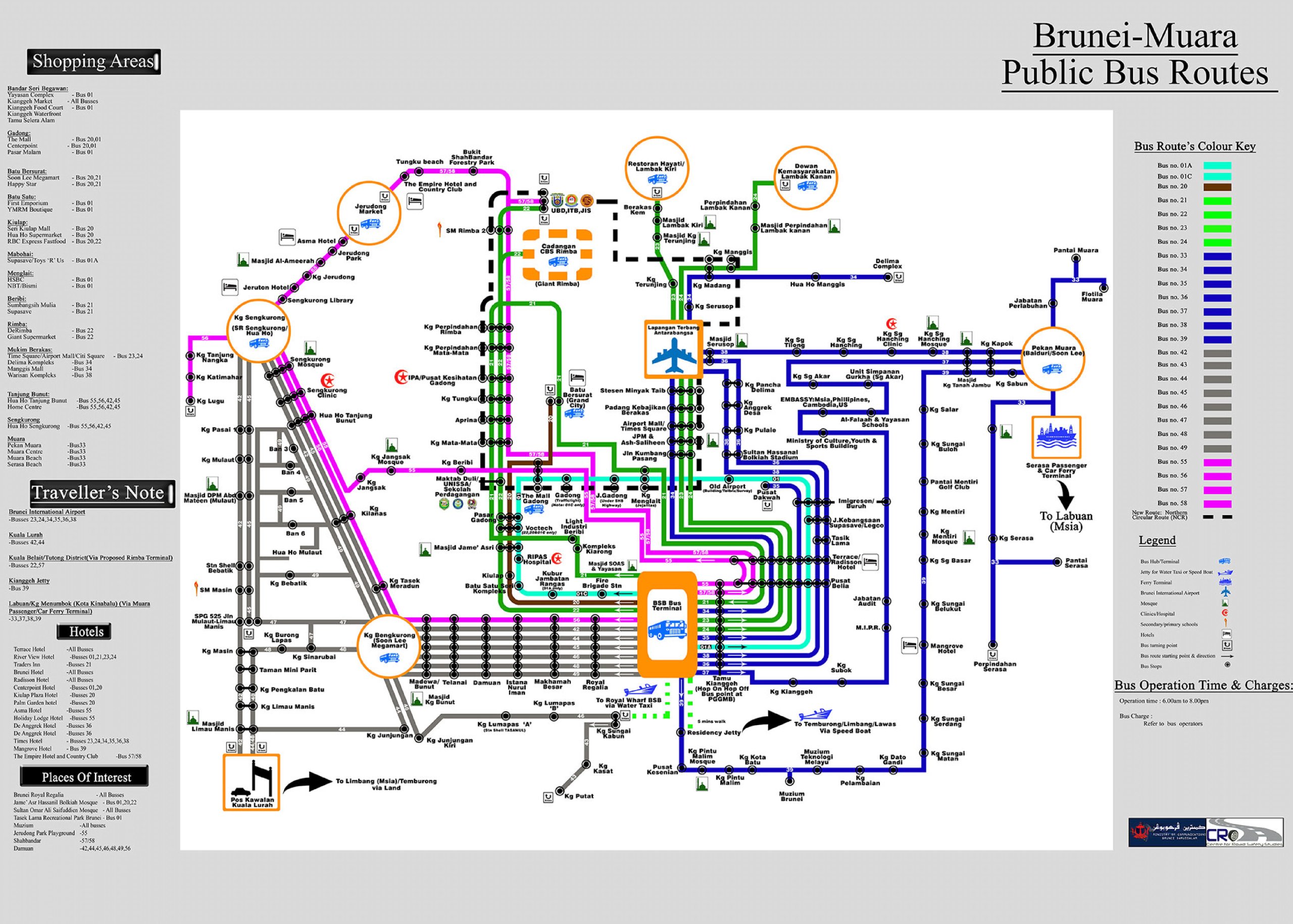 - Linjene 01A, 01C, 20, 22 - går fra sentrum til Gadong Night Market