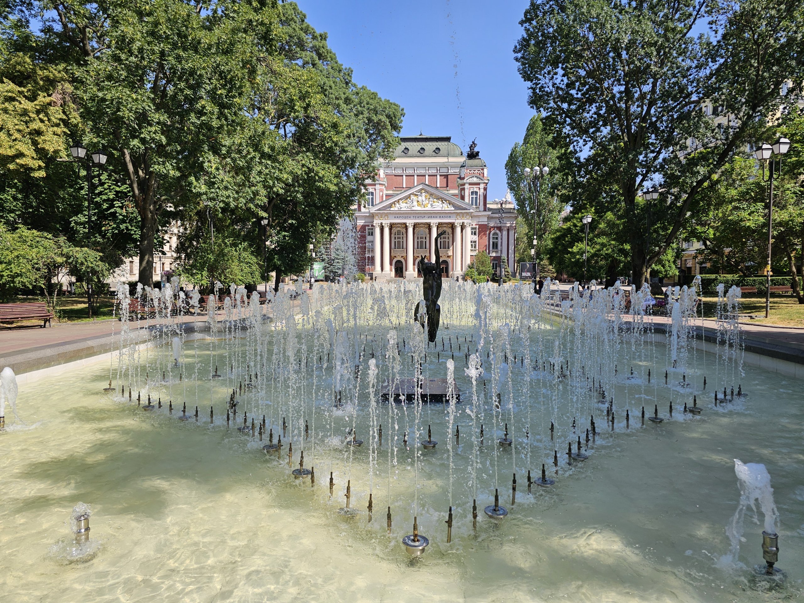 Foran teateret er det en vakker bypark med en fontene.