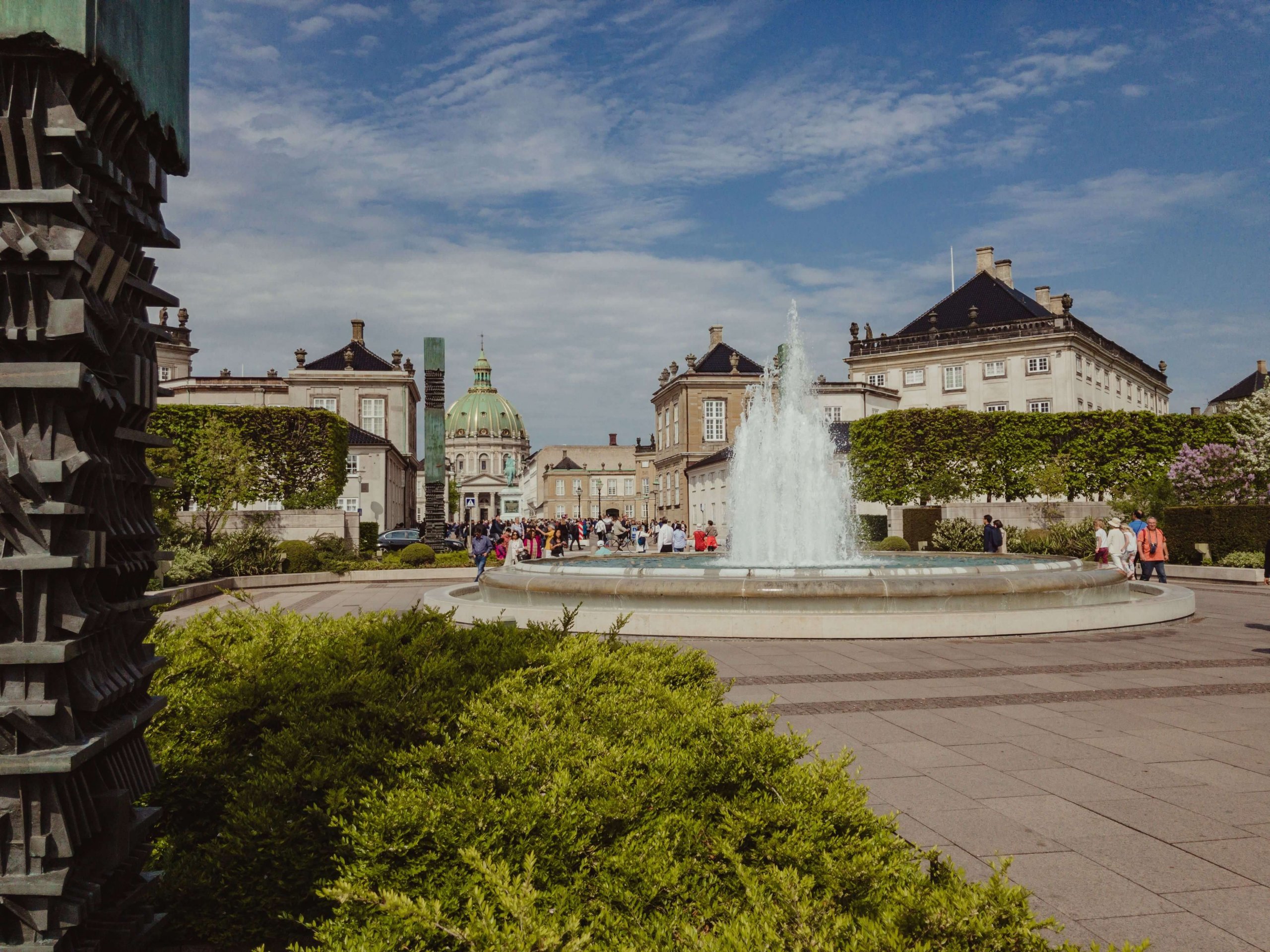 På den sentrale plassen midt på Amalienborg står den kongelige garde med sine typiske høye hatter og holder vakt ved hovedresidensen.
