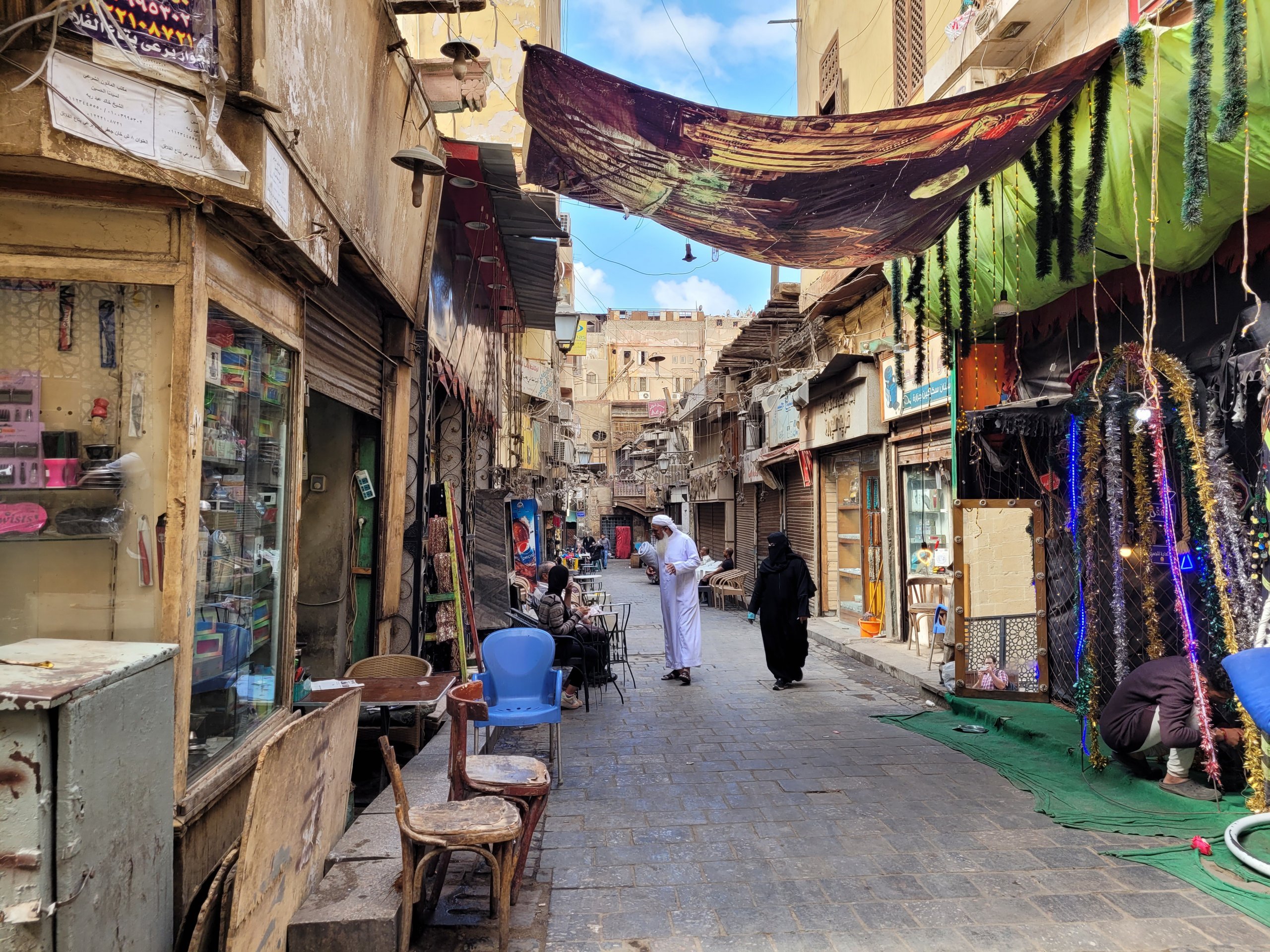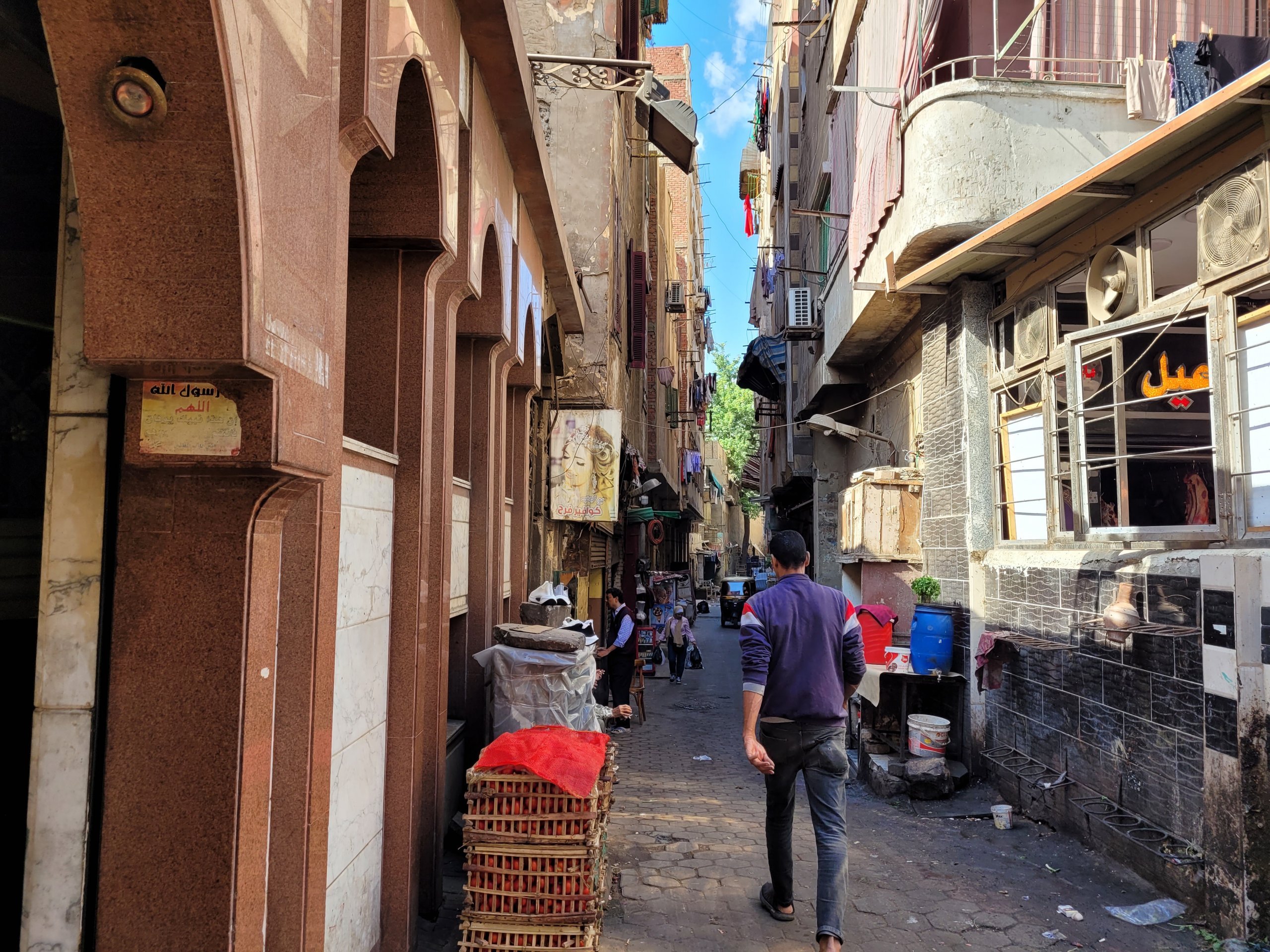 Så å si hele hovedgaten som strekker seg fra nord til sør, er en eneste stor souq, som er en annen betegnelse på en basar eller rett og slett en markedsplass. Mens det islamske Kairo nordover fra Al-Azhar-moskeen er mer turistpreget med mange kles- og suvenirbutikker, er det islamske kvarteret sørover fra hovedmoskeen mye mer autentisk.