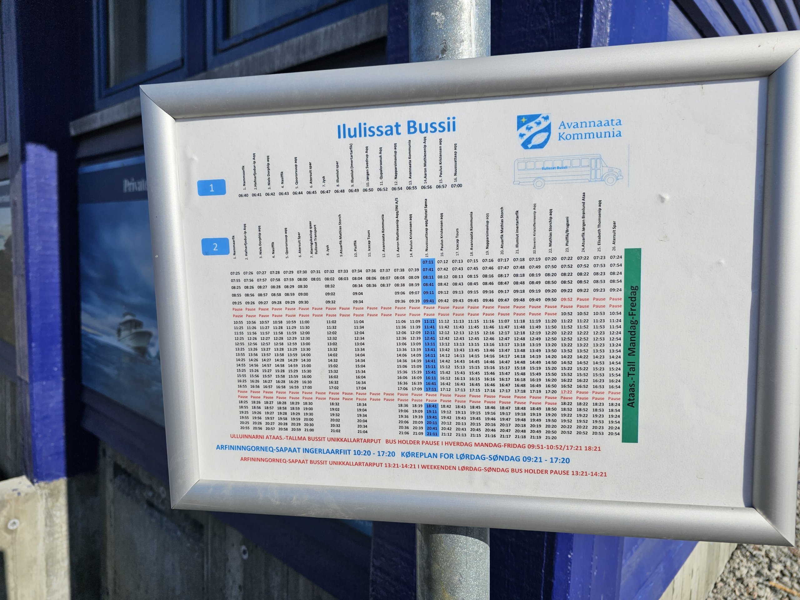 Selv om du kan lese på mange forskjellige nettsteder at det ikke finnes noen offentlig bussforbindelse i Ilulissat, er det faktisk en ganske hyppig offentlig bussforbindelse som kjører gjennom hele byen.