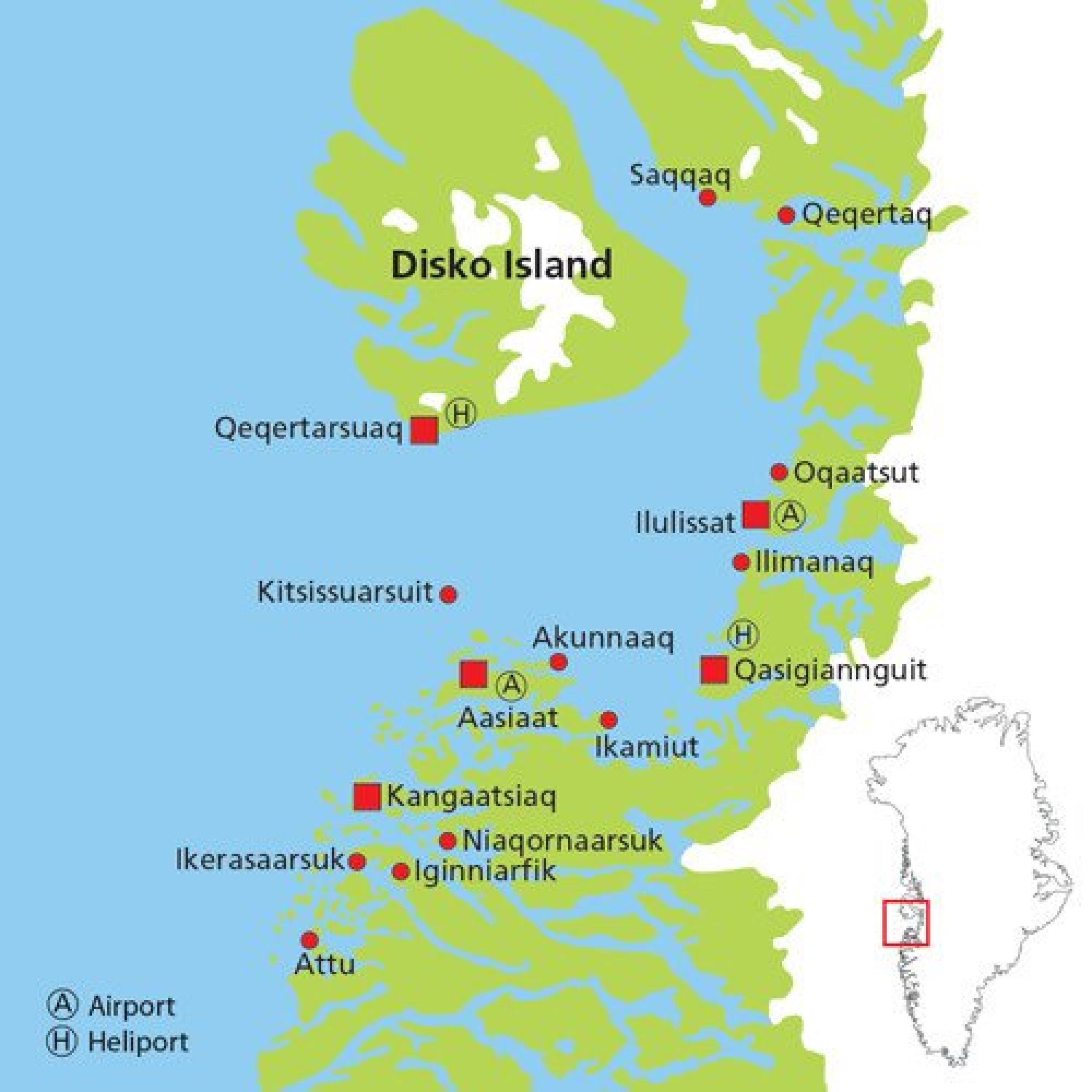 - Diskobukta - hovedsakelig mellom Ilulissat og omkringliggende byer som Aasiaat, Ilimanaq, Qeqertarsuaq, Qasigiannguit, Akunnaaq, Qeqetaq, Kitsissuarsuit, Kangaatsiaq og andre.