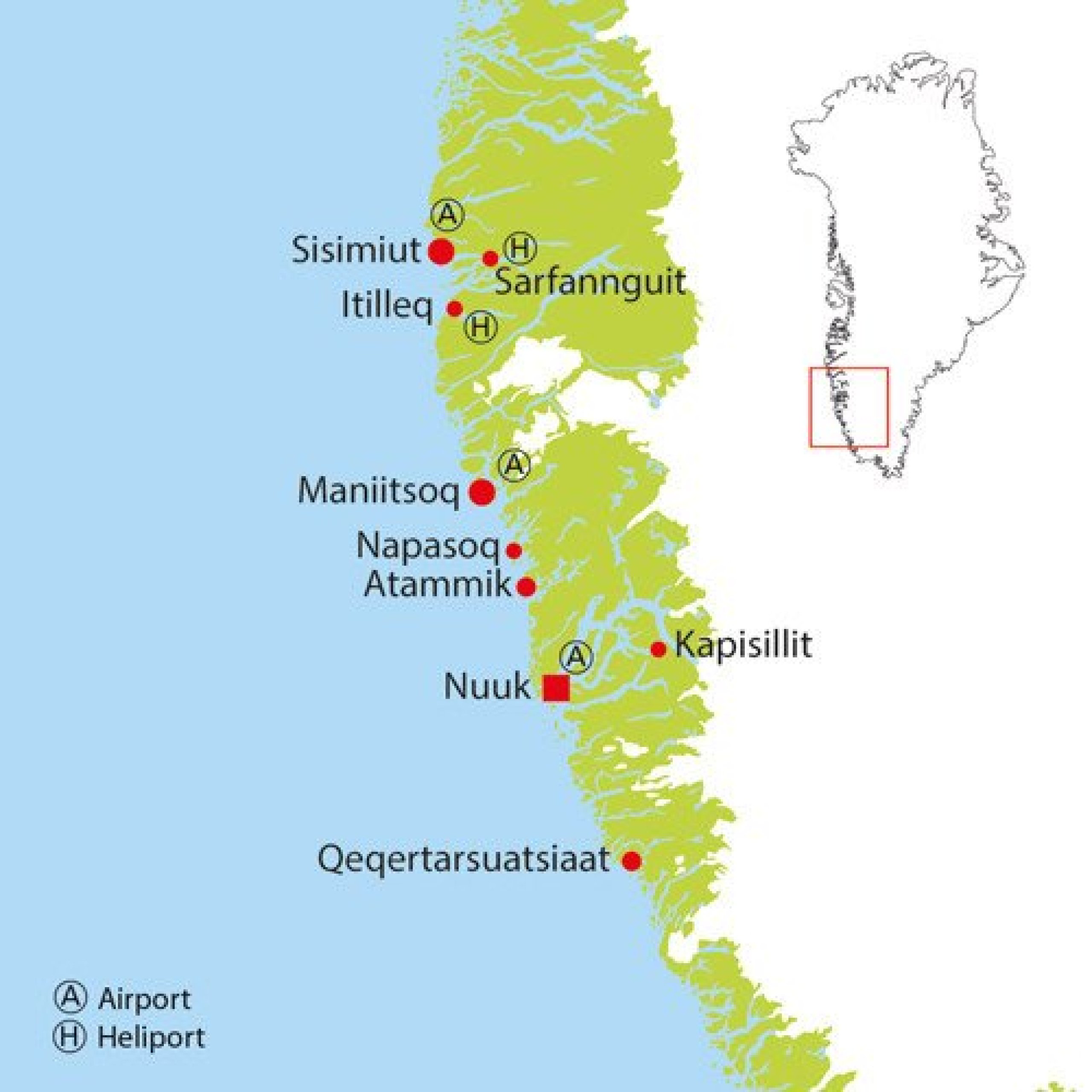 - Vestkysten - båtene forbinder hovedsakelig hovedstaden Nuuk med byer som Sisimiut, Maniitsoq, Kapisillit, Qeqertarsuatsiaat, Sarfannguit, Atammik og andre.