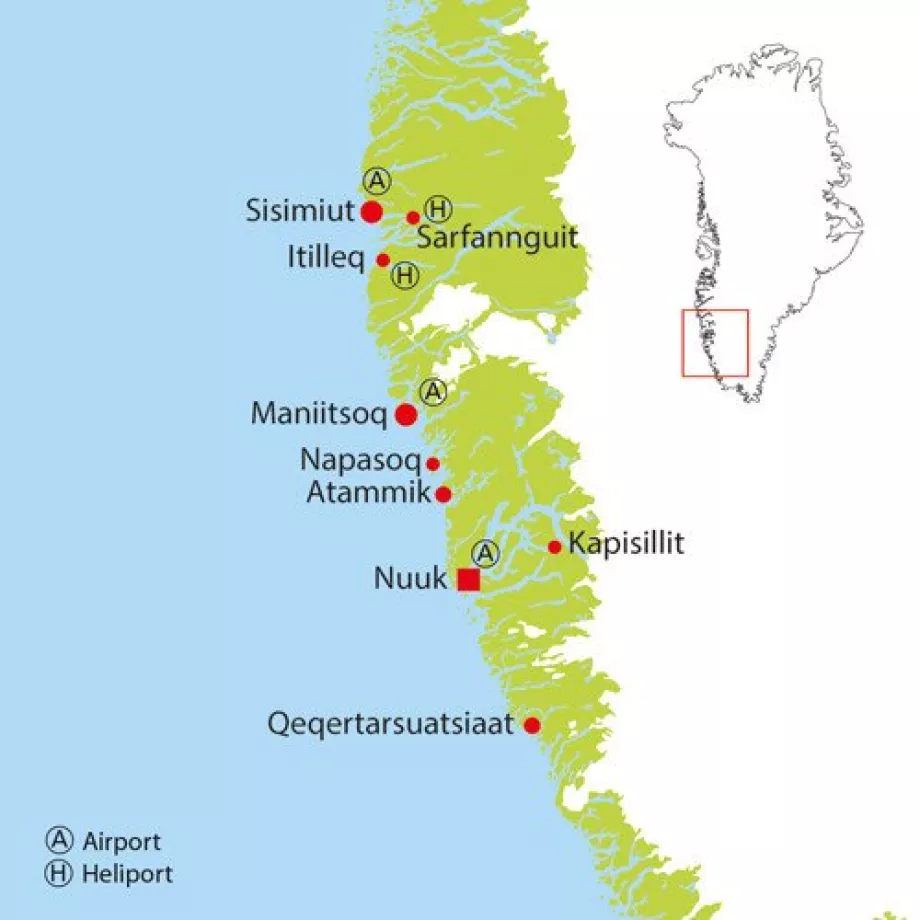 - Sør-Grønland - bredt rutenettverk rundt Narsaq, Narsarsuaq, Qaqortoq, Nanortalik med flere