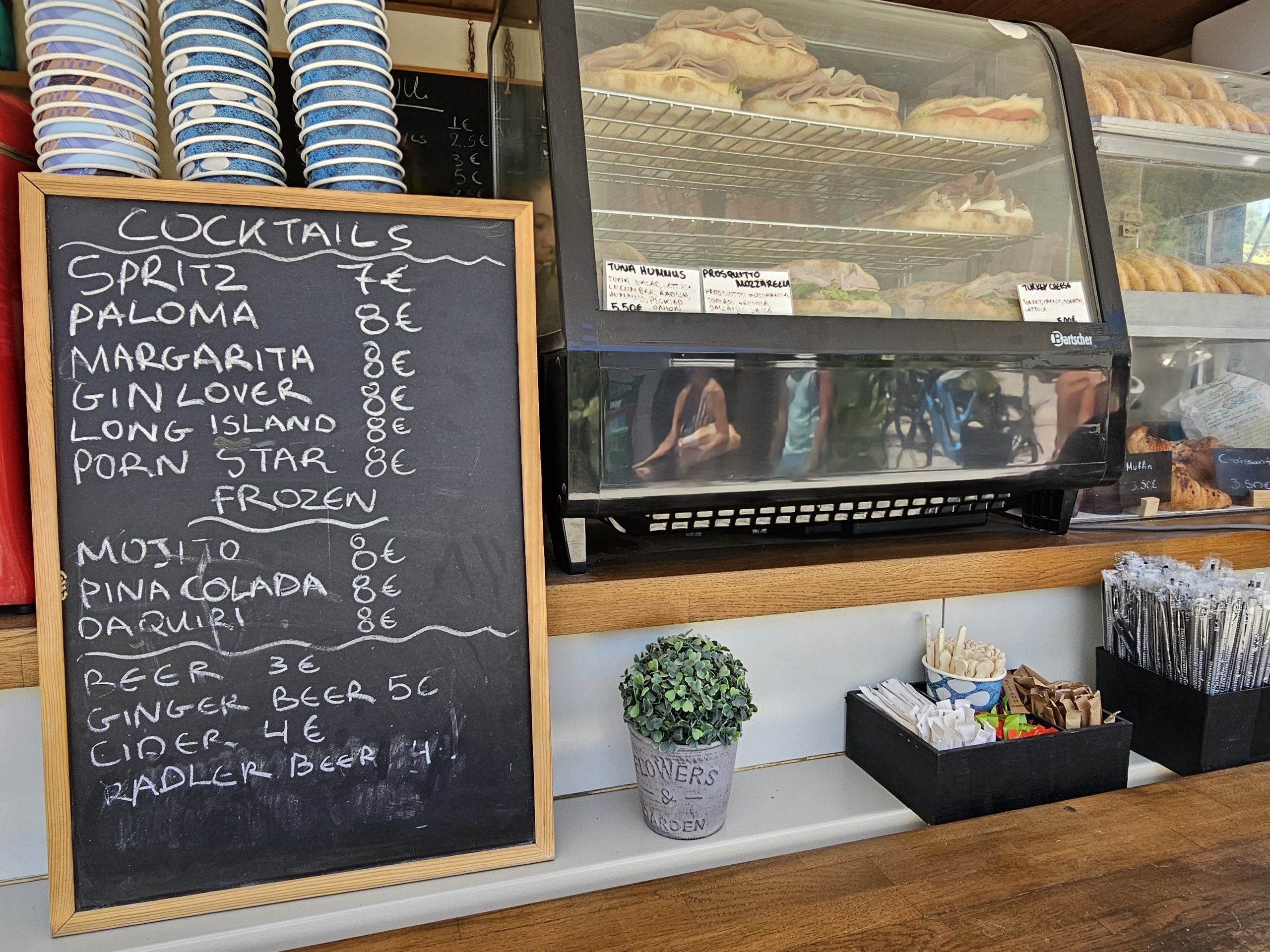 Rett ovenfor stranden ved parkeringsplassen er det en klassisk restaurant (ganske høye priser - musaka rundt 15 euro) og en liten bistro der prisene derimot er veldig rimelige (sandwich rundt 6 euro, noe som er lavere enn i mange supermarkeder).
