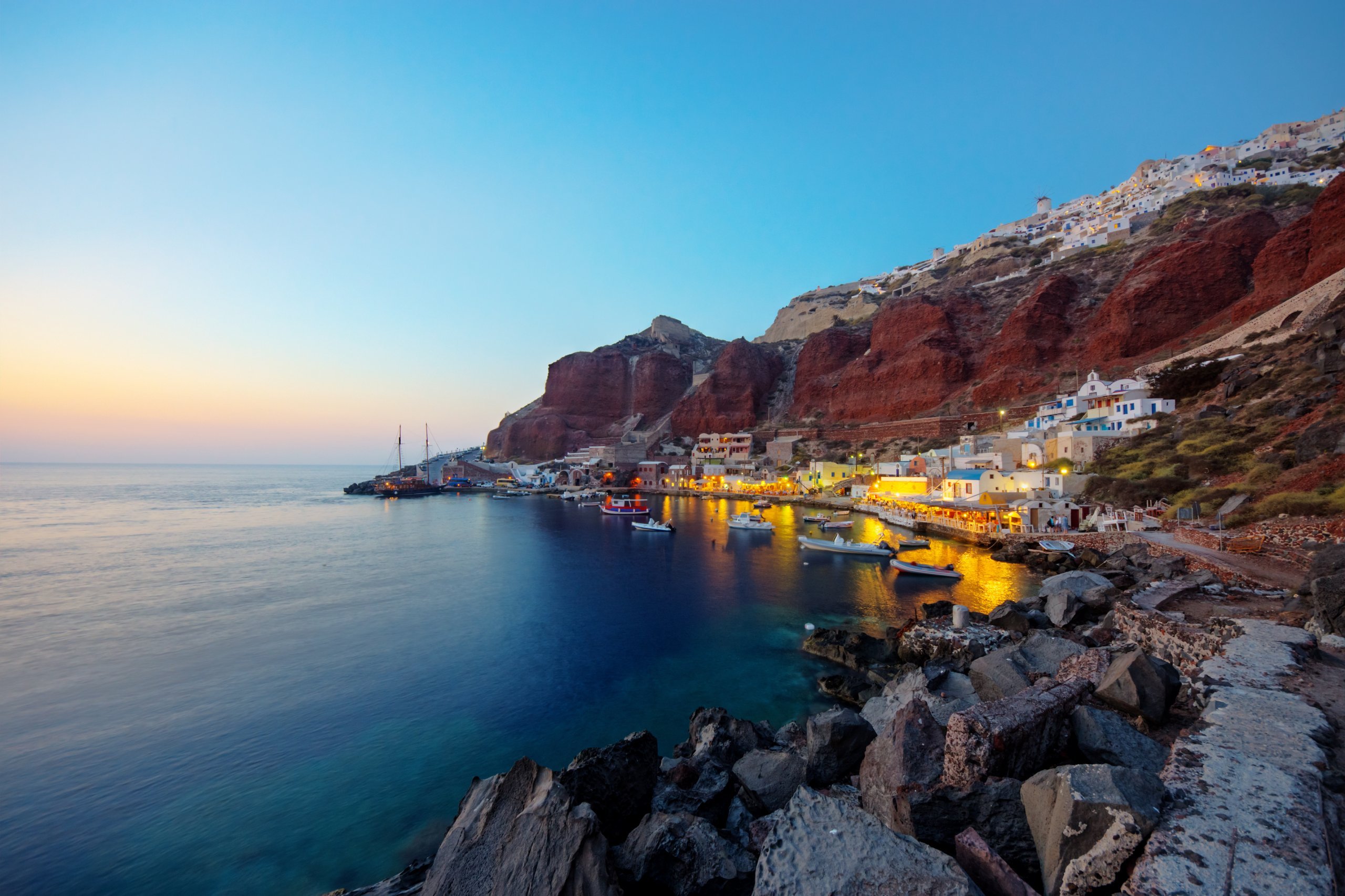Den lille havnen i Ammoudi-bukten er et populært utfartssted fra den berømte landsbyen Oia, som den ligger nedenfor. Ammoudi-bukten er omgitt av eksotiske røde klipper og asurblått hav, og byr på en spektakulær utsikt over bukten med de to øyene.