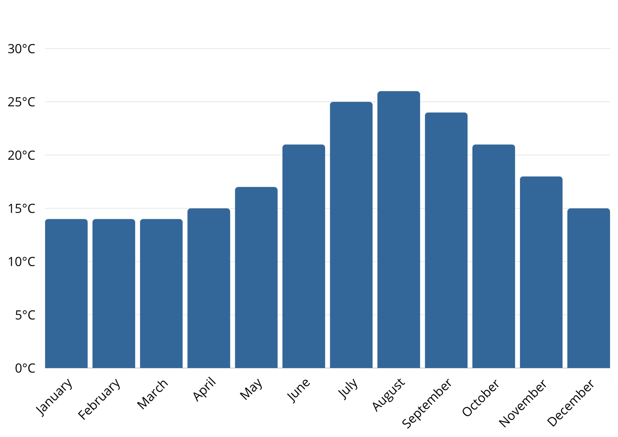 Ta en titt på de detaljerte vanntemperaturene på Sardinia gjennom året og velg dine feriedatoer.