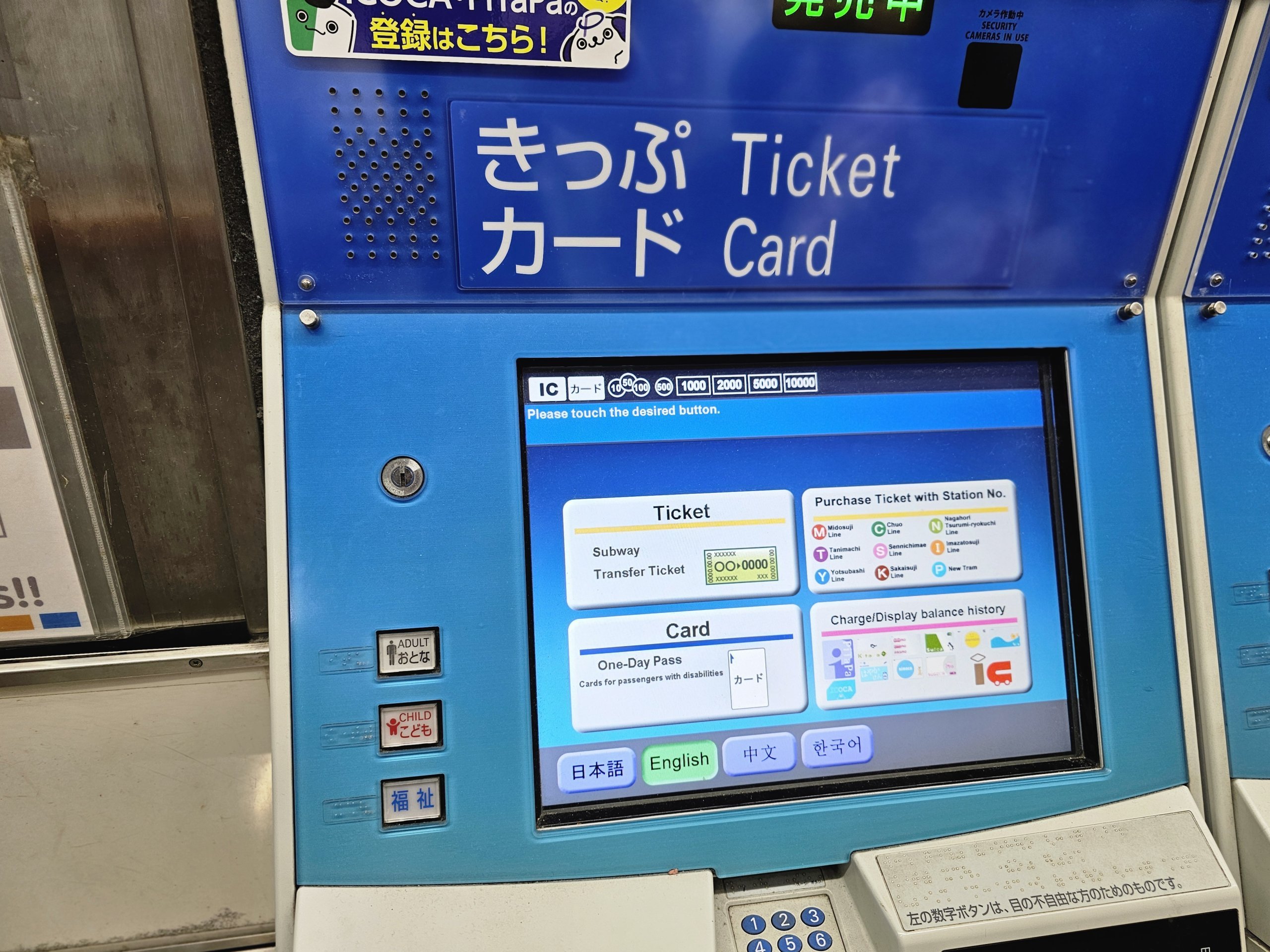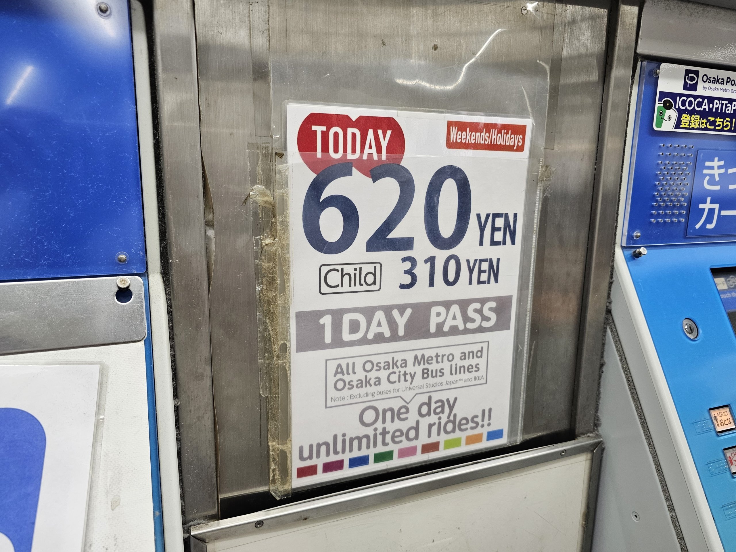 Icoca-kortet selges i Osaka og kan kjøpes fra en automat på alle metrostasjoner for 500 jpy. Du velger selv hvor mye du vil fylle på kortet.