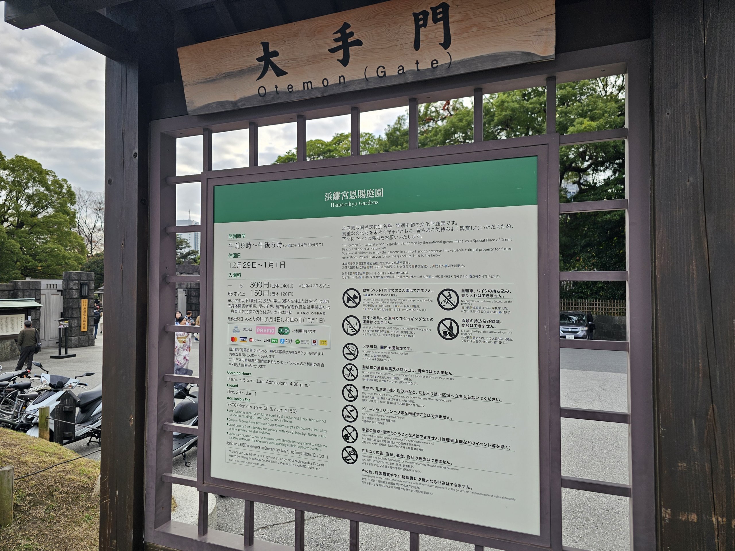 Det er en inngangsbillett til Hama-rikyu-hagene på 300 jpy.