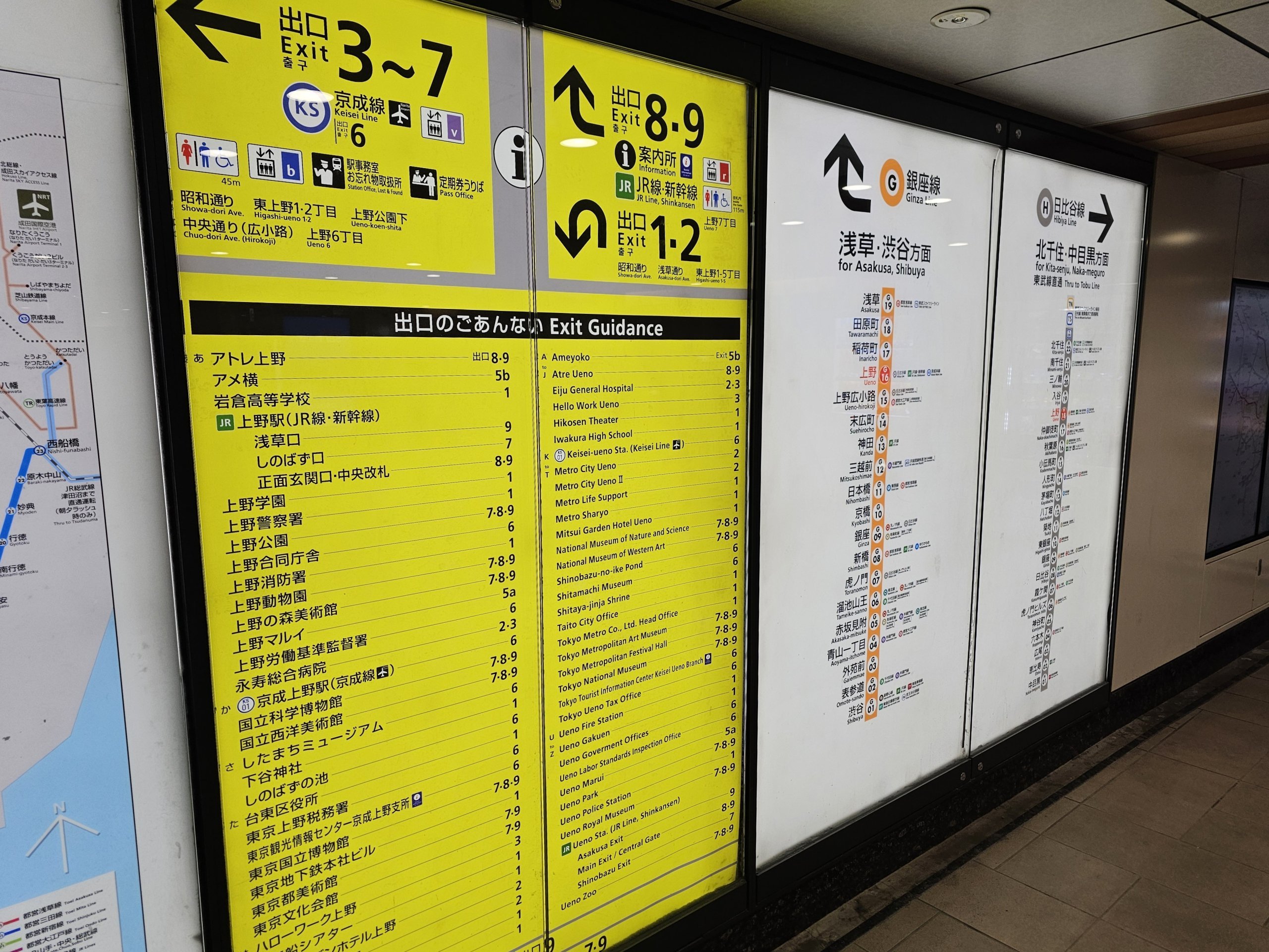 På kartet er de ulike utgangene fra stasjonen alltid markert med bokstaver. Disse bokstavene er deretter tydelig markert med gult på hele stasjonsområdet.
