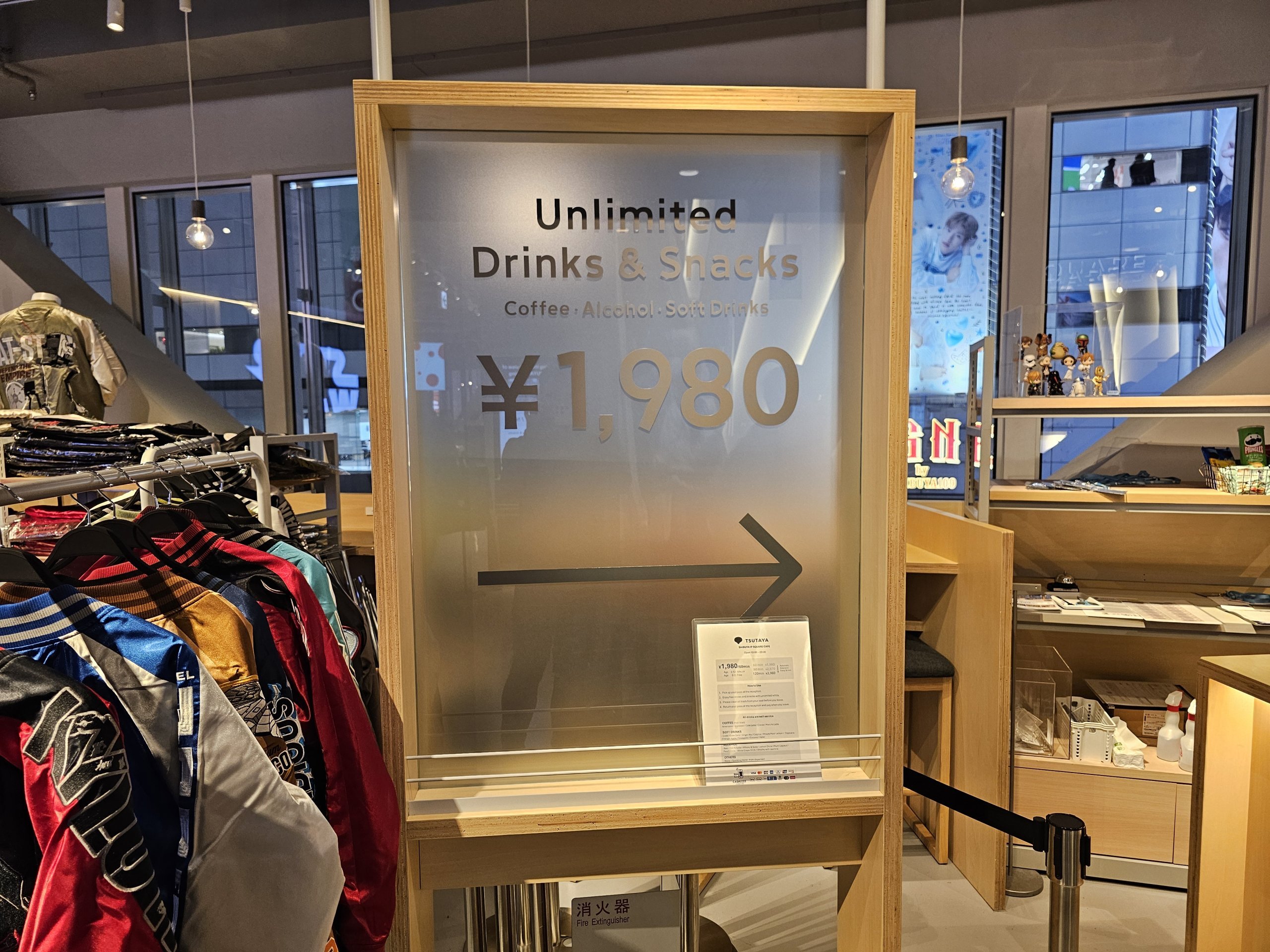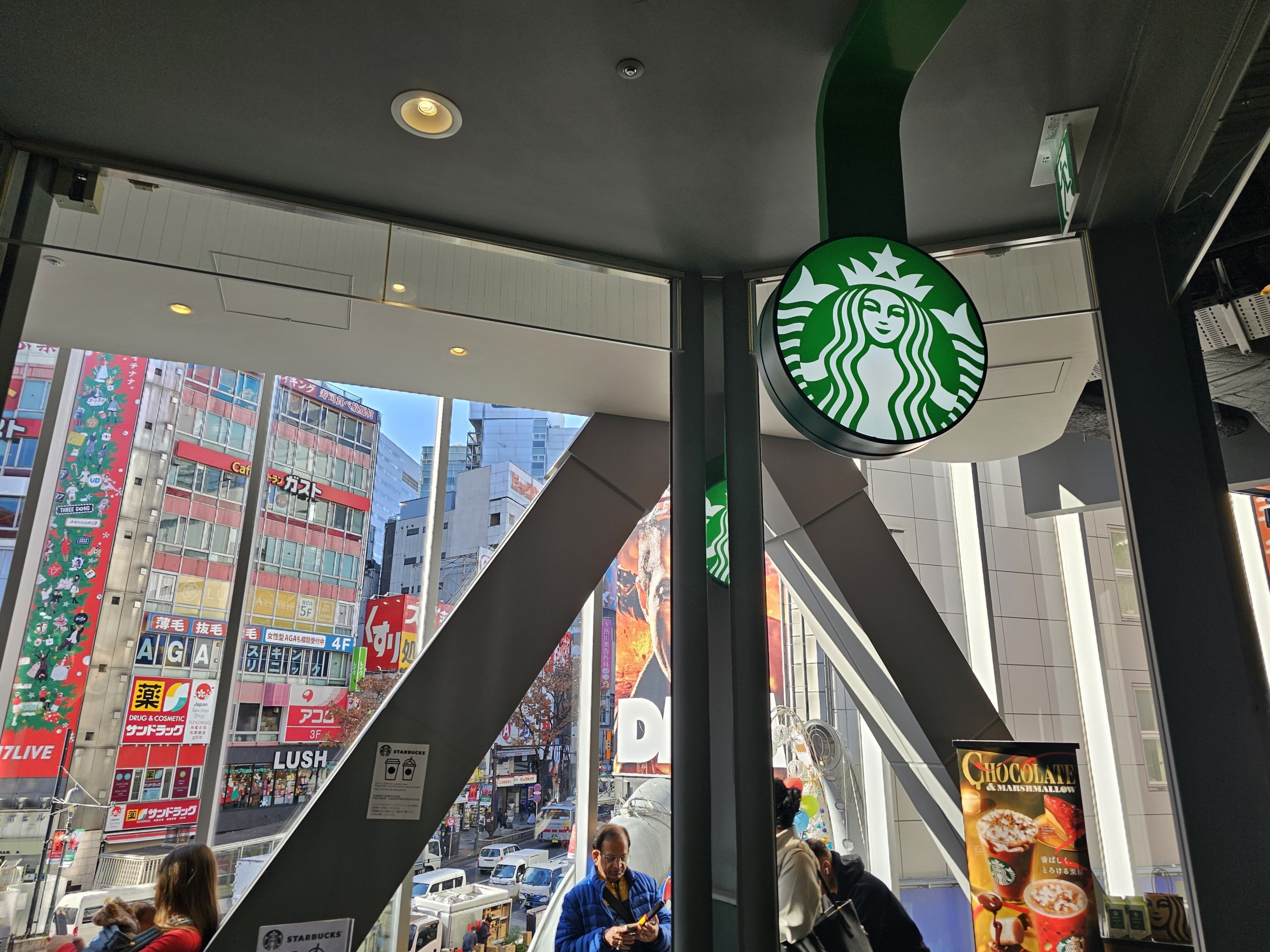 Den har en fin utsikt over Shibuya-krysset, selv om den ikke er like perfekt som Share Lounge, da den er litt hindret av takkonstruksjonen.