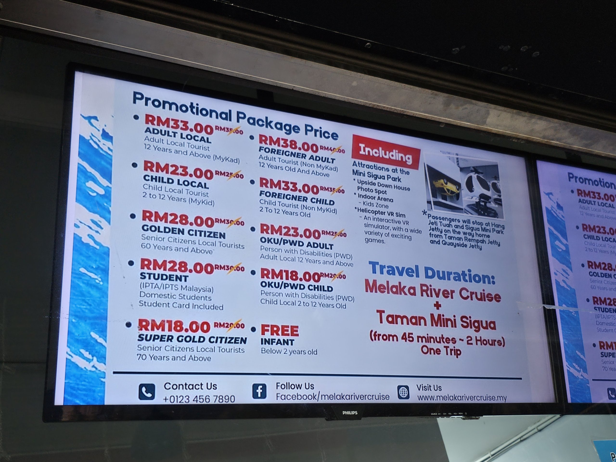 Flere selskaper tilbyr slike i Malacca (for eksempel Melaka River Cruises), og alle cruisene starter og slutter i den sørlige utkanten av det historiske sentrum (se plassering på kartet), med mulighet for å betale for enten et sightseeingcruise eller en hop-on-hop-off-billett og gå i land i ulike havner underveis.
