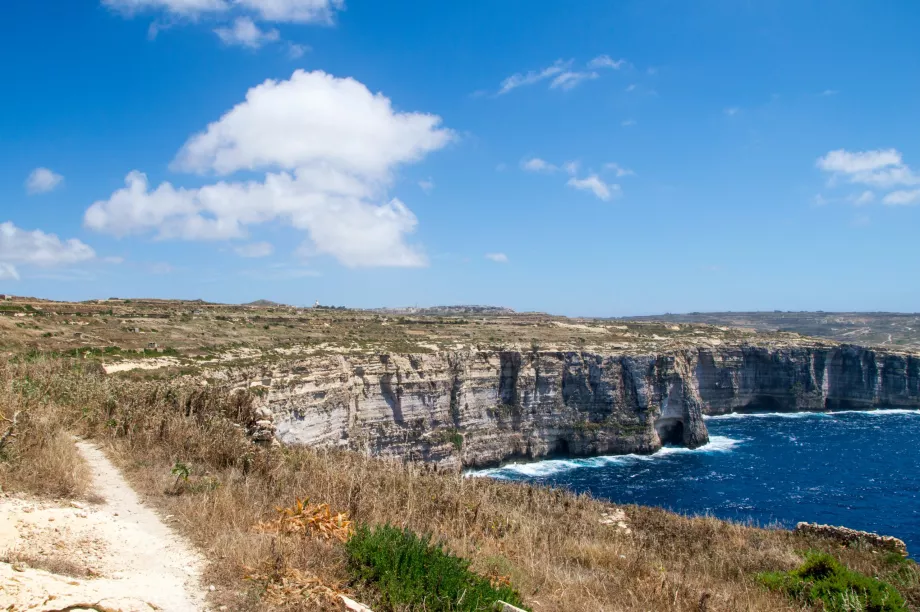 - Blå - fortsetter fra Xlendi til San Lawrenz. Ruten er 11 km lang og regnes som moderat utfordrende. Du kommer til Dwerja Bay, der det nå kollapsede Azure Window lå.