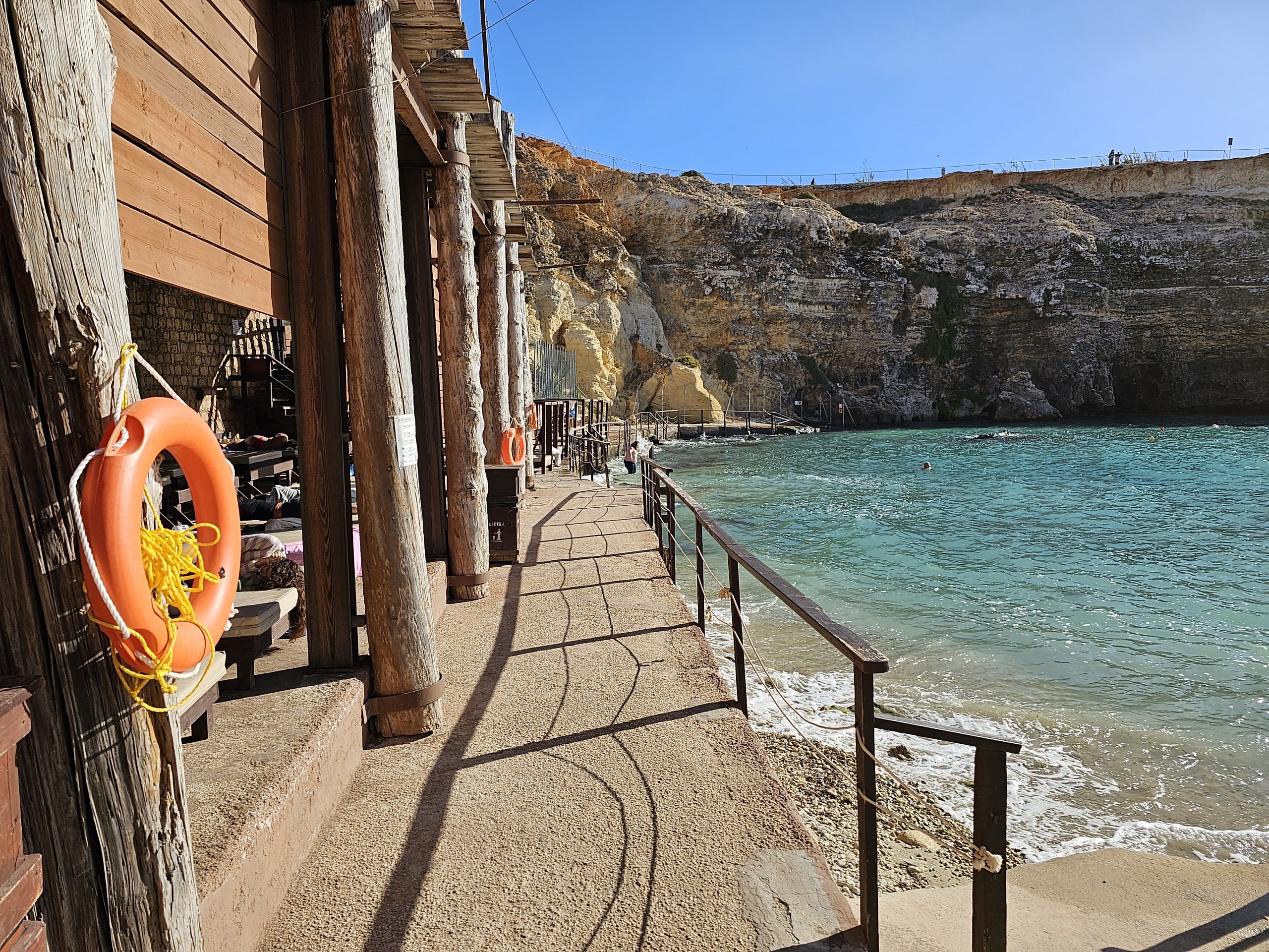 Nederst i landsbyen er det en betongbrygge ved sjøen med trappetrinn rett ut i havet. Her er det komfortable solsenger rundt om hvor du kan tilbringe hele dagen.