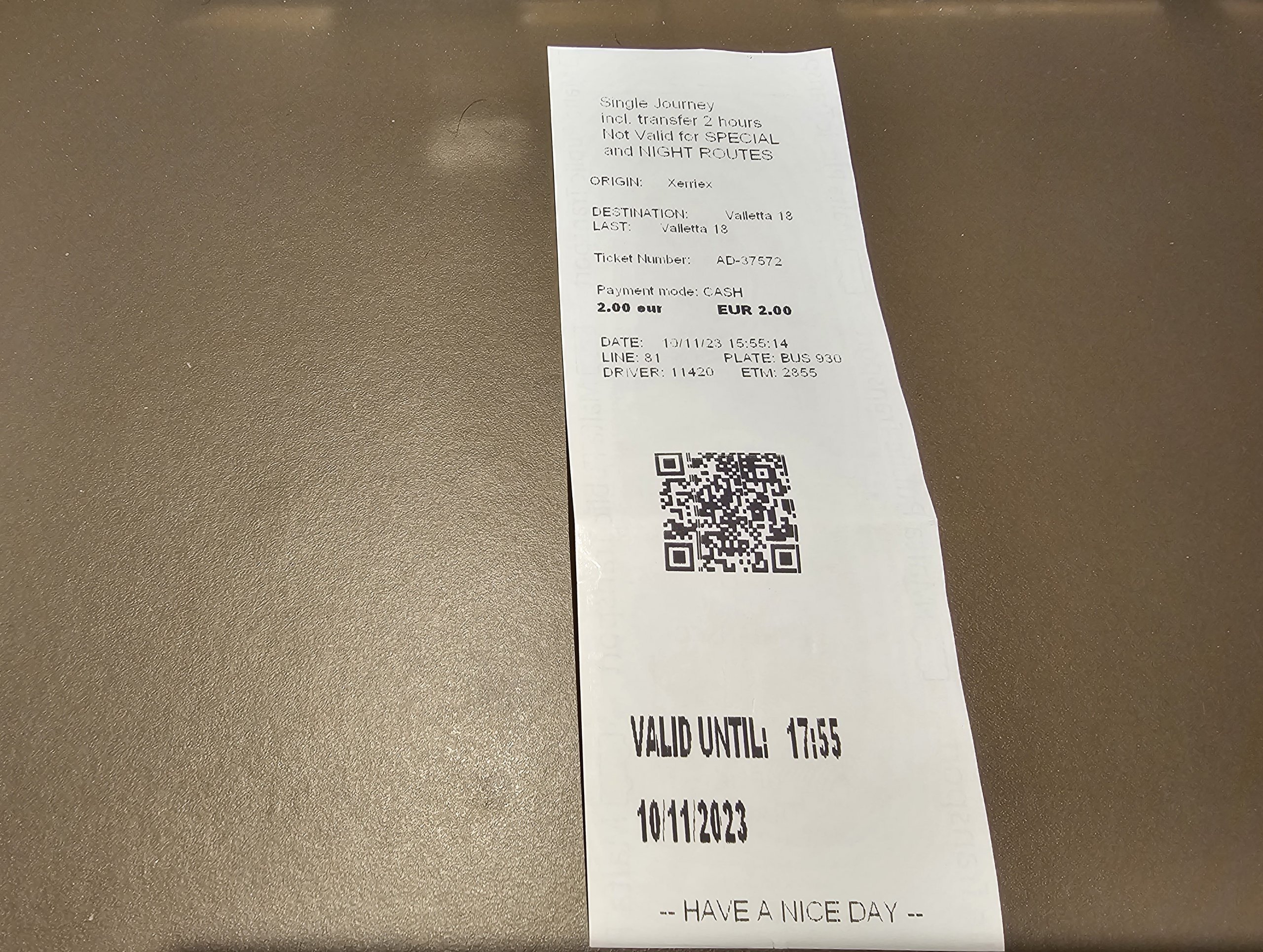 Billetten er gyldig i 2 timer, og du kan bytte mellom bussene. Du kan bare kjøpe billetten fra sjåføren, der du kan betale med kontanter eller kort.