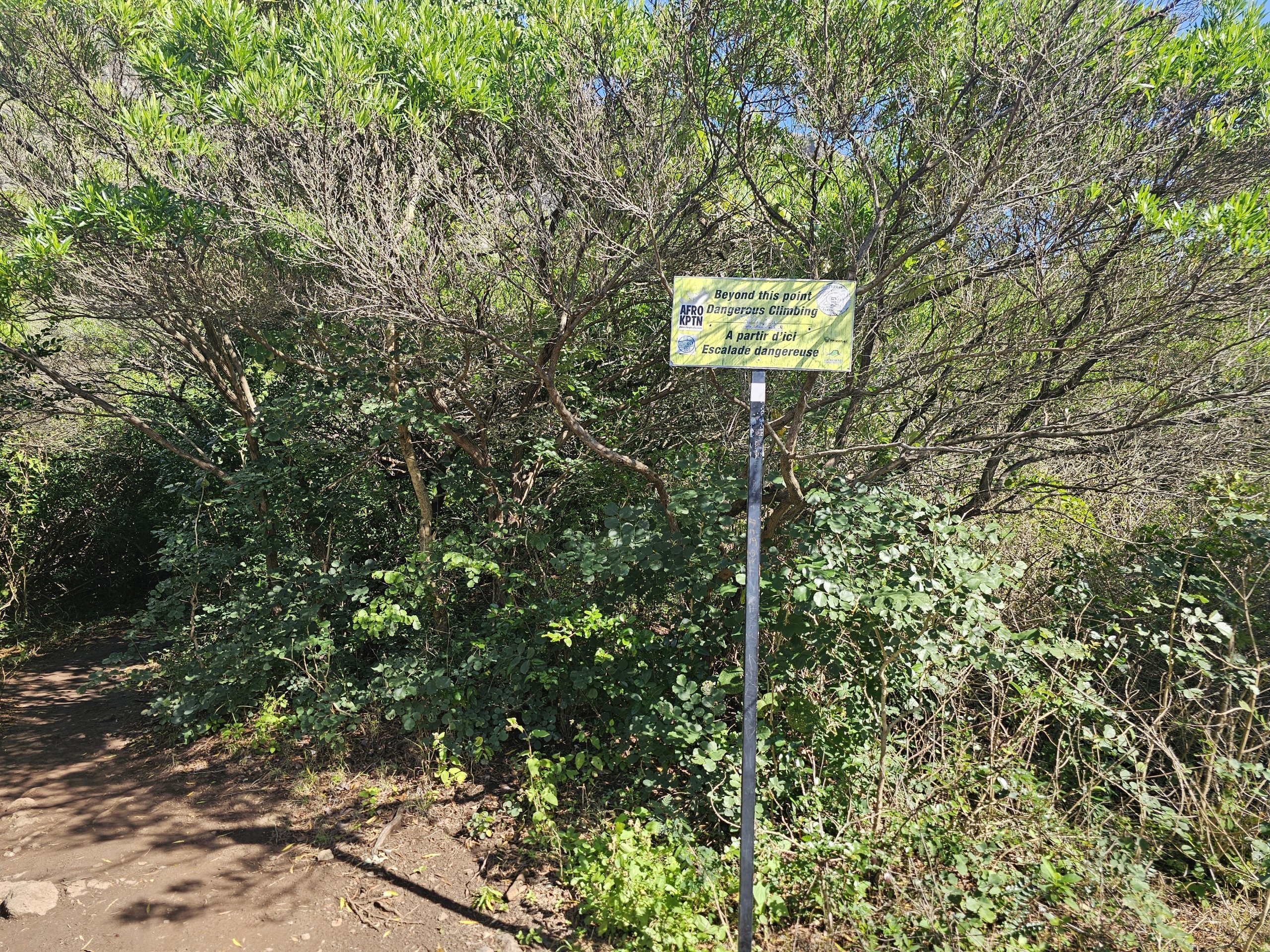 Fra dette punktet blir stien mye mer utfordrende. Jeg passerer et advarselsskilt, og når jeg ser opp, er det tydelig at teksten på skiltet må være sann!