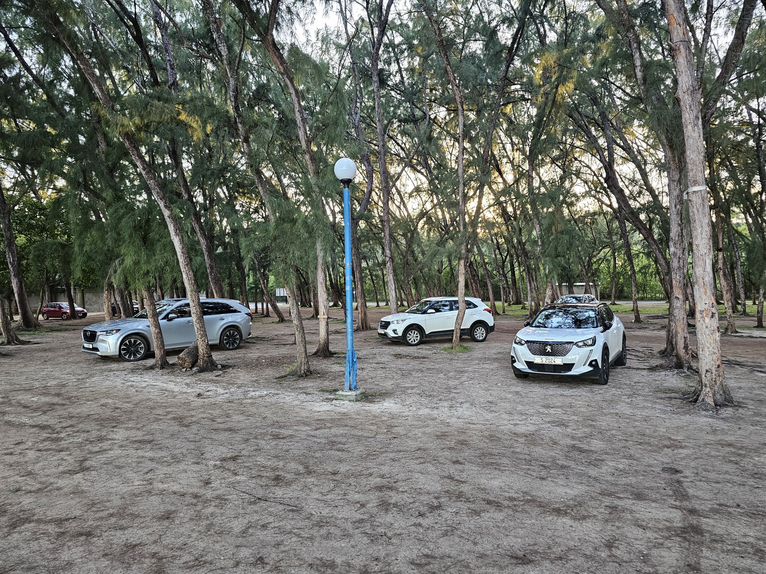 Mellom stranden og veien er det et bredt belte med trær, som skjuler ulike boder med snacks og lokale delikatesser.