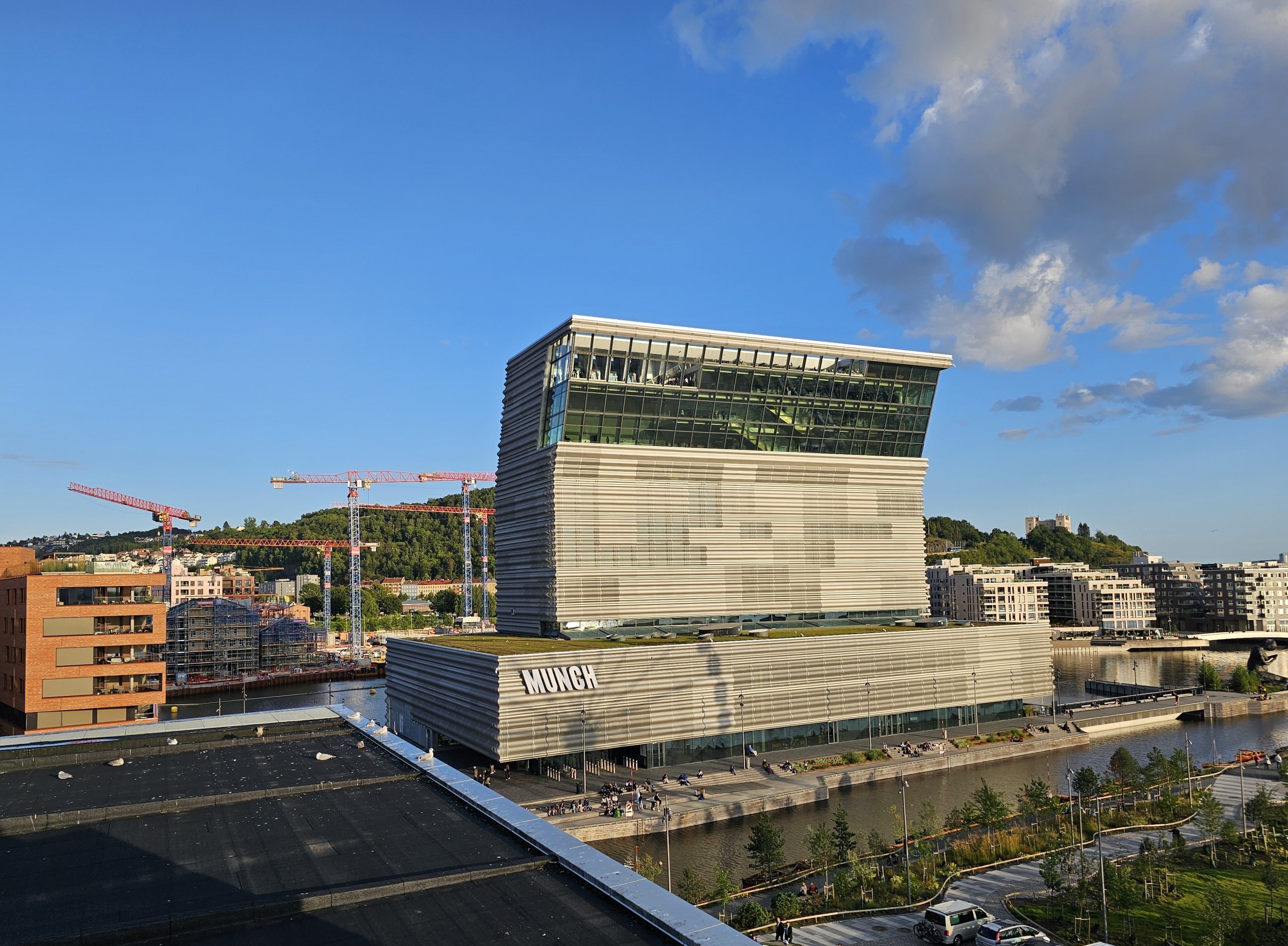 Rett ved siden av ligger Munchmuseet, som i tillegg til sine verdifulle samlinger kan skilte med en av Oslos mest iøynefallende moderne bygninger.
