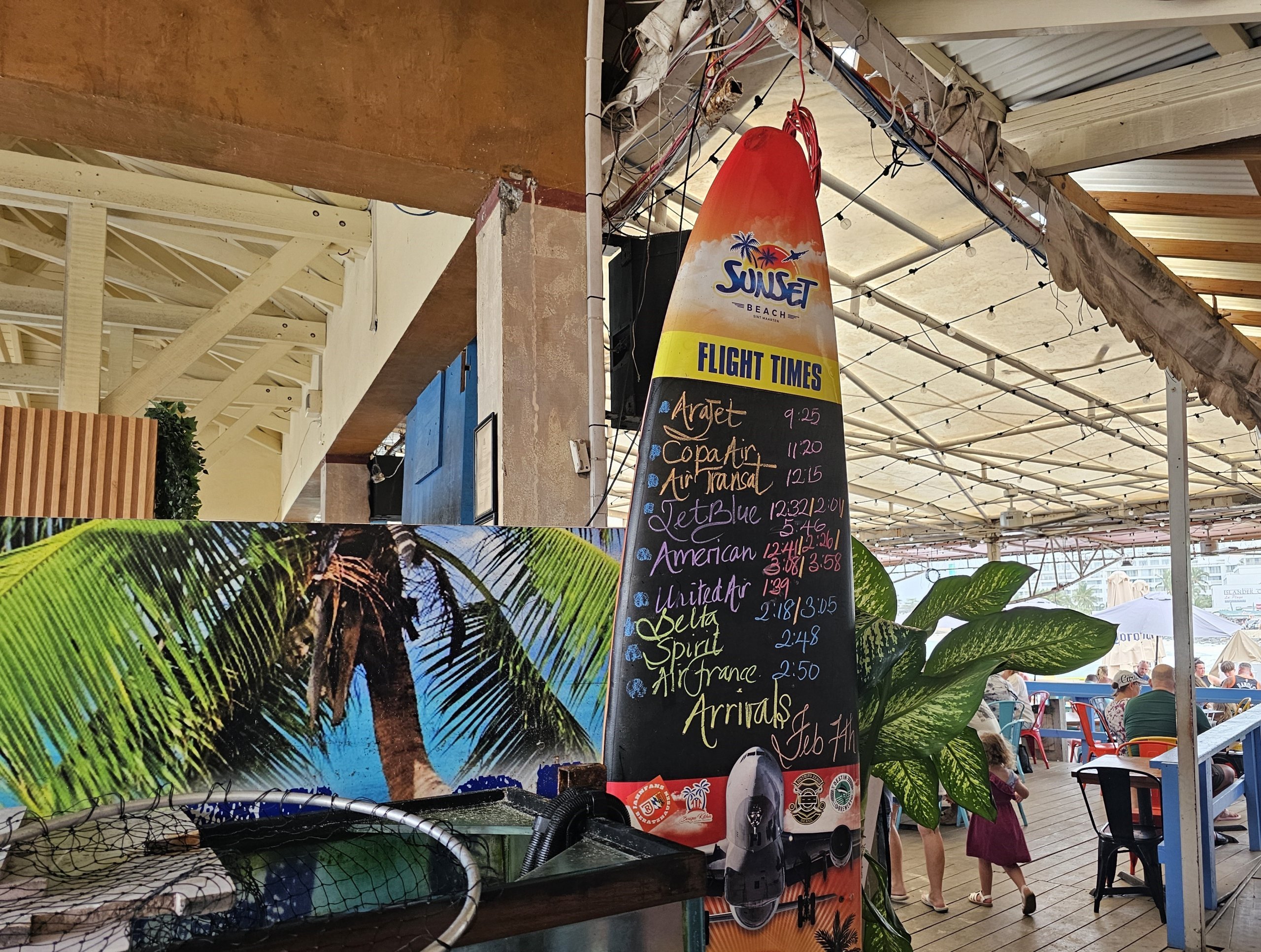 I baren er det installert en skjerm med aktuelle ankomster og avganger, samt det berømte surfebrettet, der personalet hver morgen viser ankomstene til de store flyene.