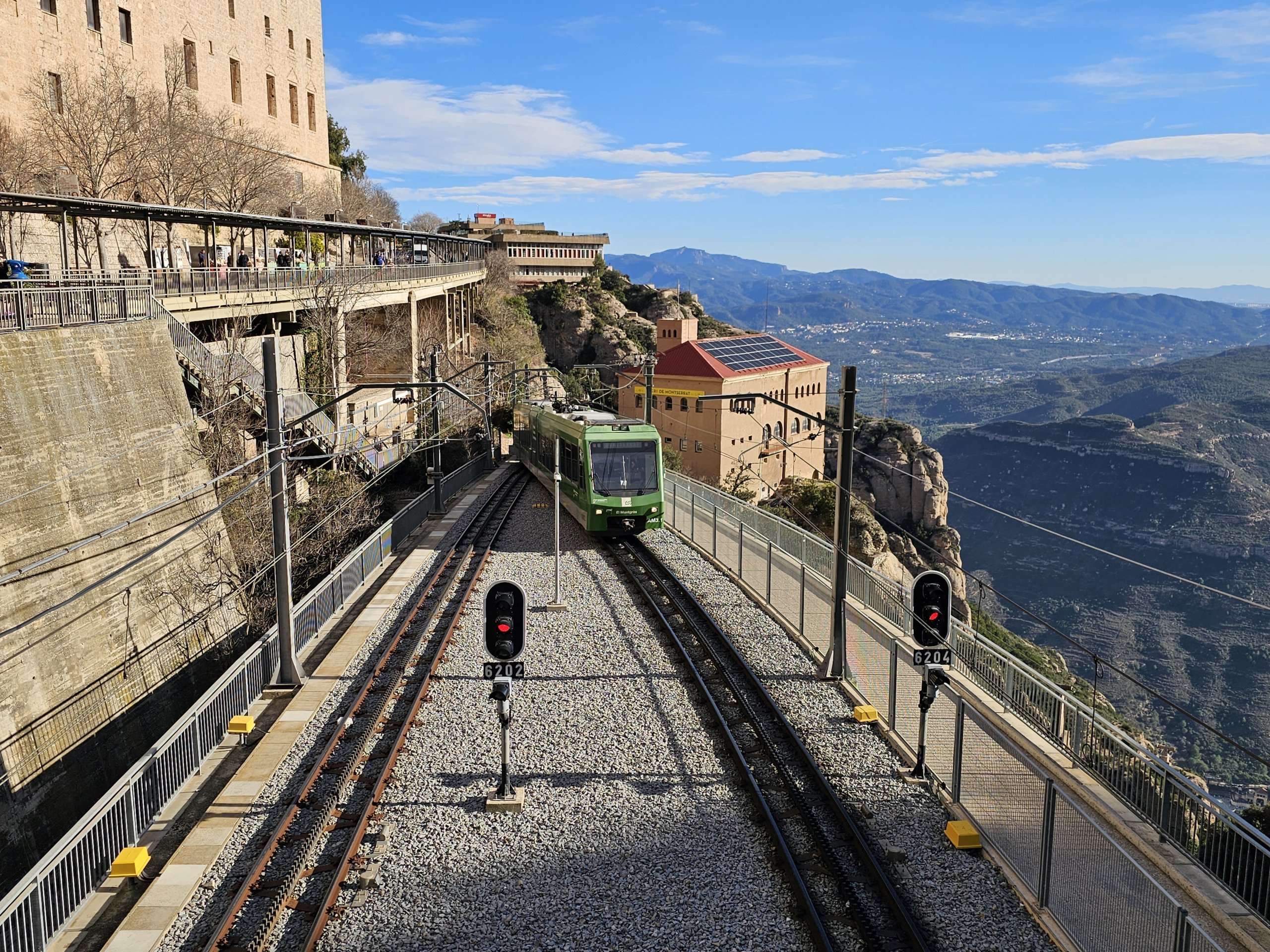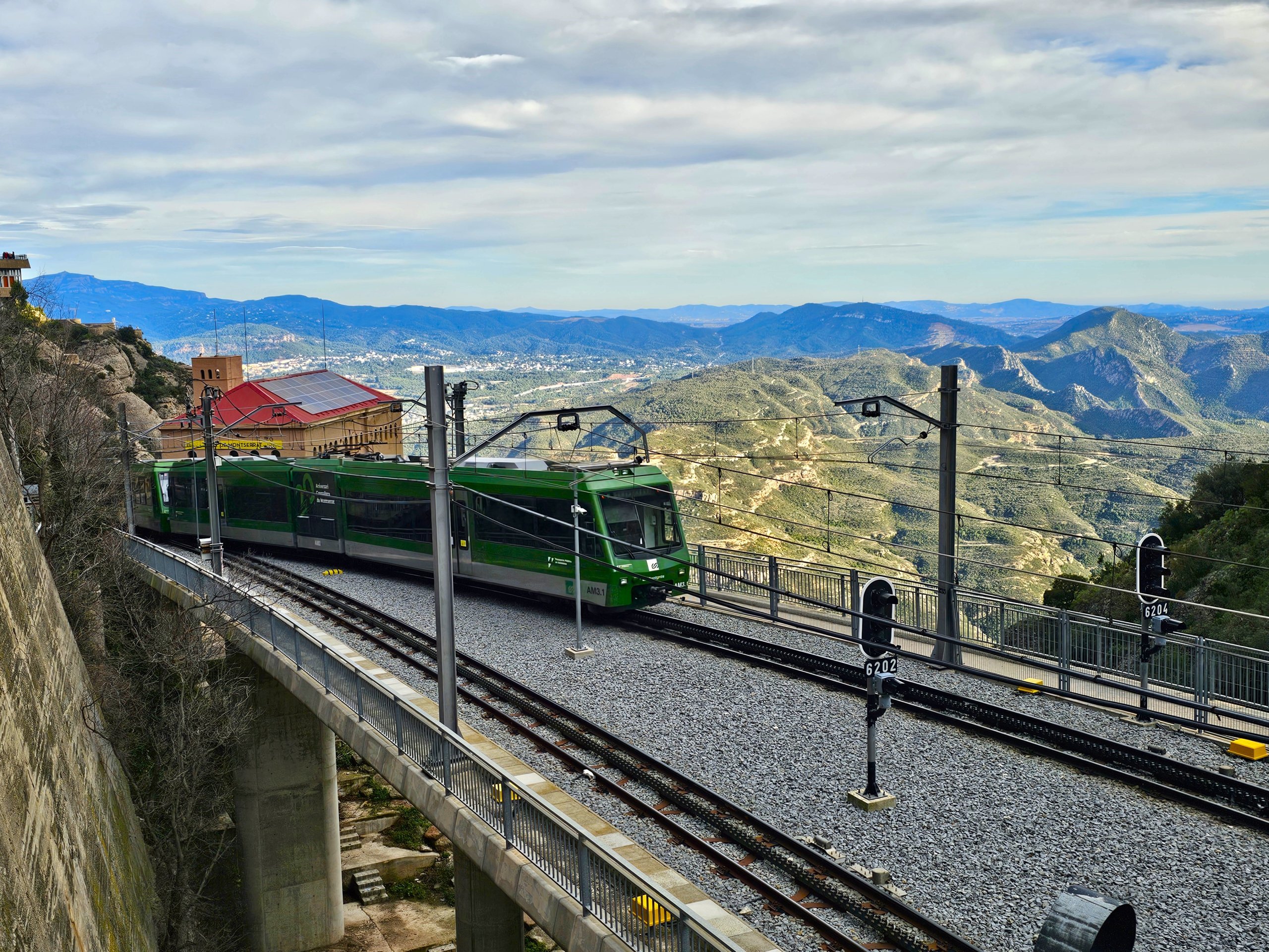 - Deretter er det kort vei til det grønne tannhjulstoget som tar deg til Montserrat. Toget går en gang i timen og har alltid forbindelse med tog til/fra Barcelona.