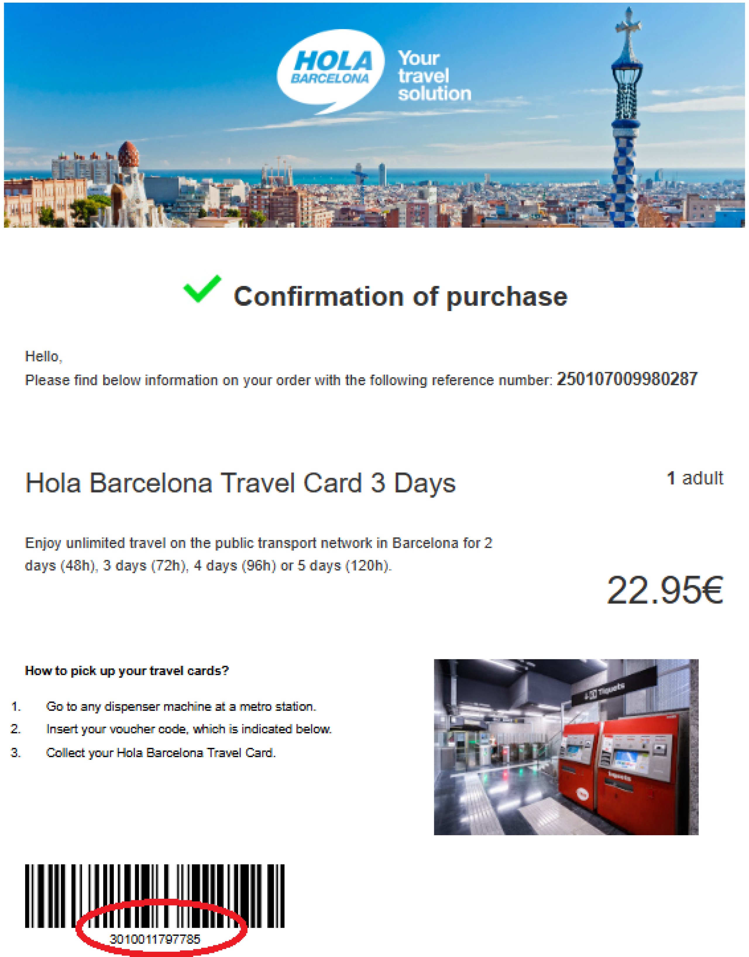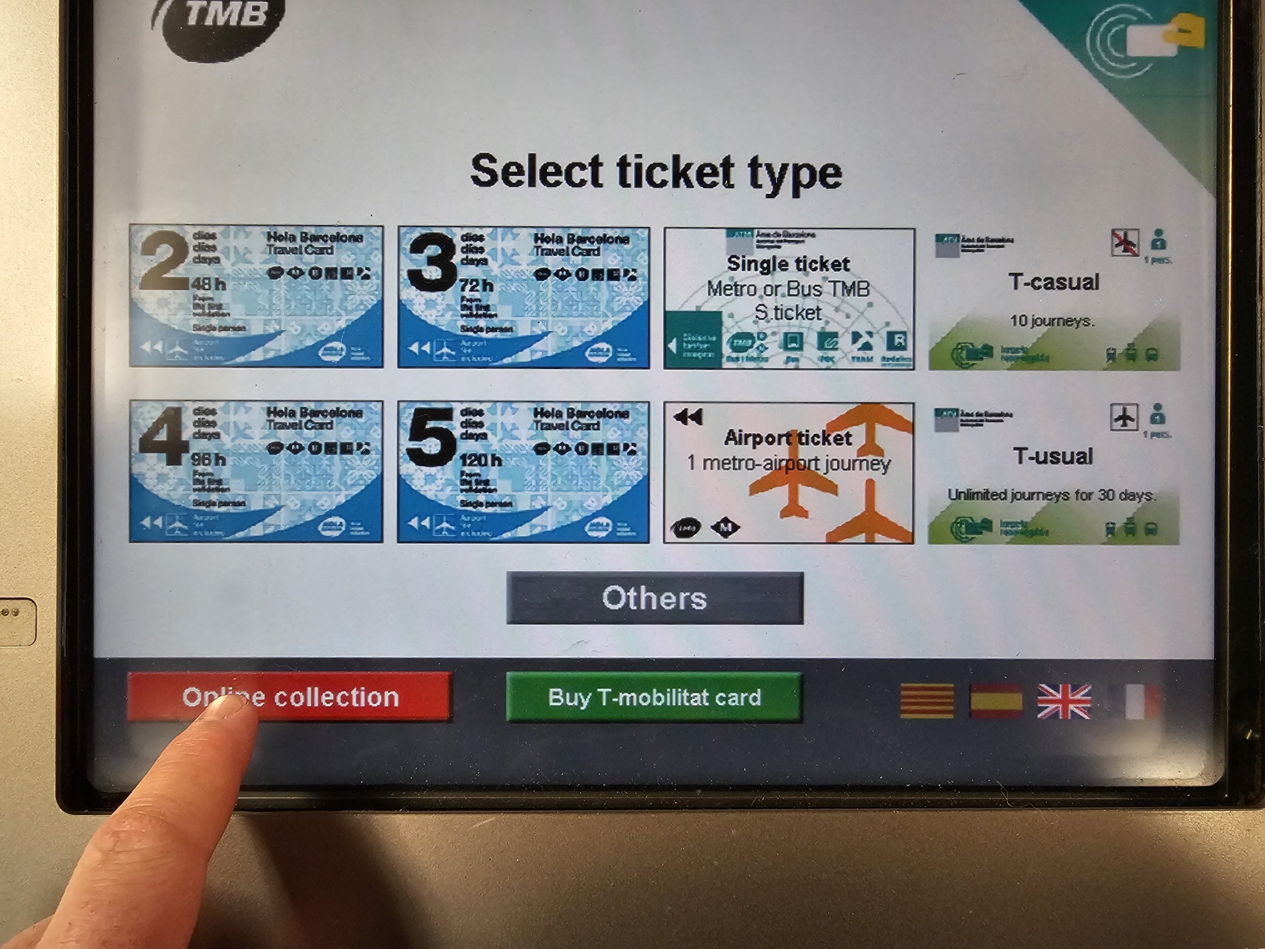 Hvis du vil kjøpe en Hola Barcelona-billett med 10 % rabatt på nettet, velger du alternativet "Online Collection" i automaten, taster inn nummeret under strekkoden og henter billetten.