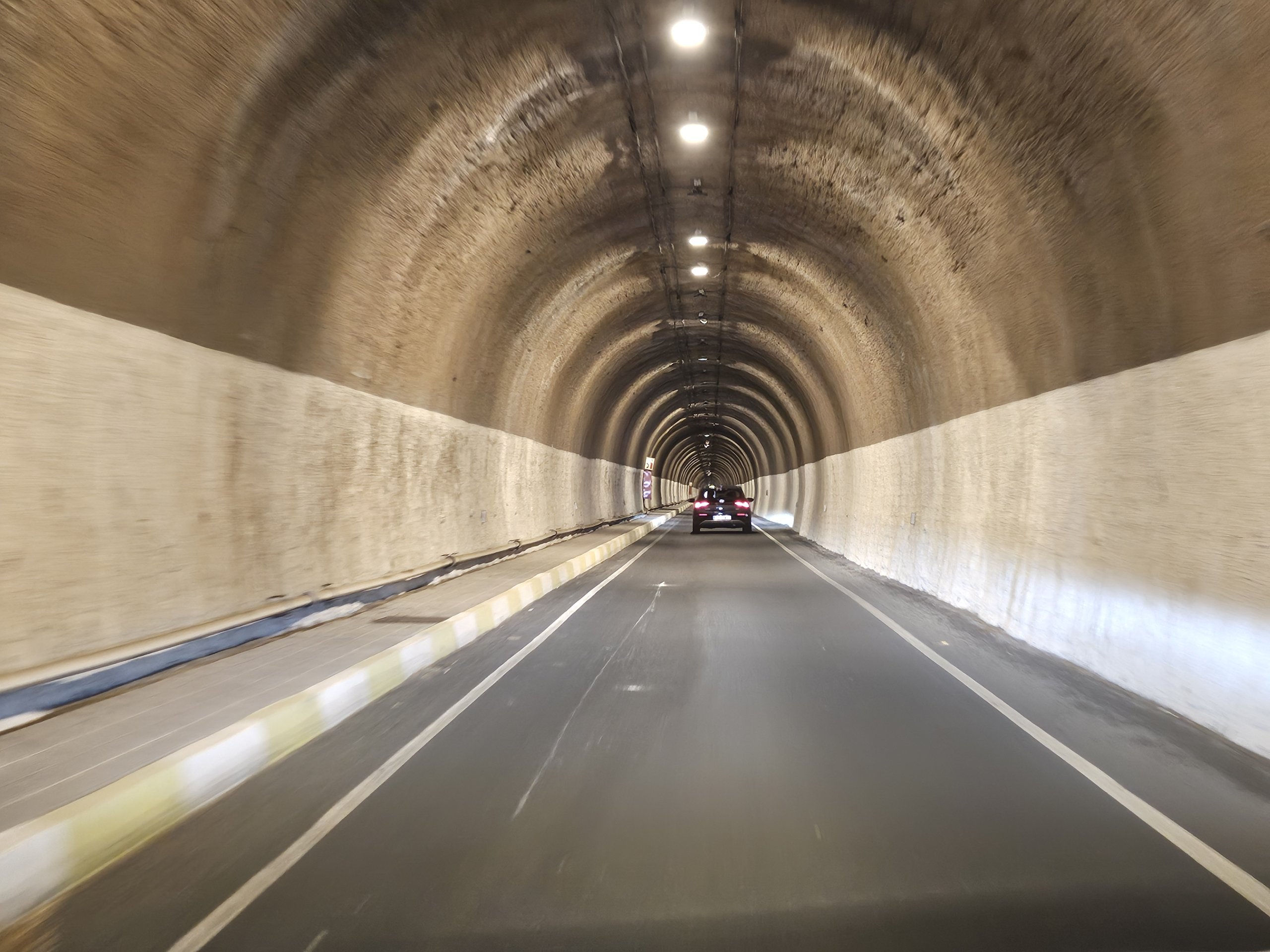 Du kjører gjennom en nesten 1 km lang enfelts tunnel der trafikken reguleres av trafikklys, ettersom du ikke kan unngå to møtende biler inne i tunnelen.