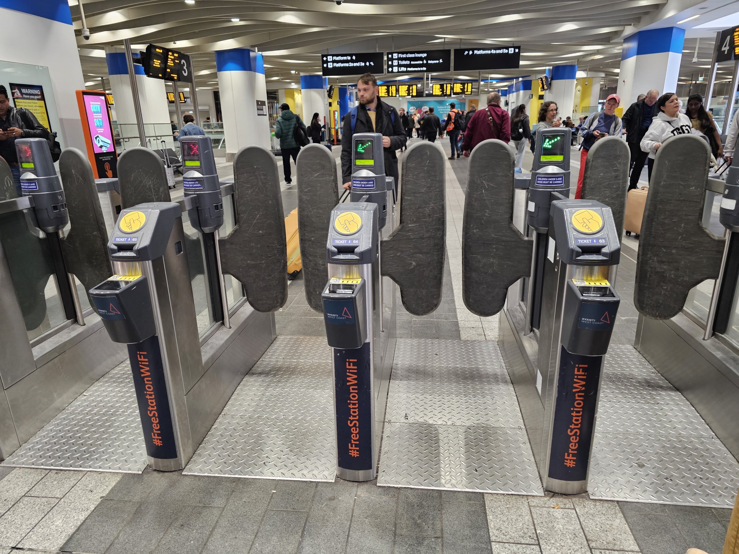 Stasjonene er tilgjengelige via dreieskinner, der du betaler billetten din ved å feste ditt eget kontaktløse kort eller Swift PAYG til leseren, akkurat som når du går ut av stasjonen.