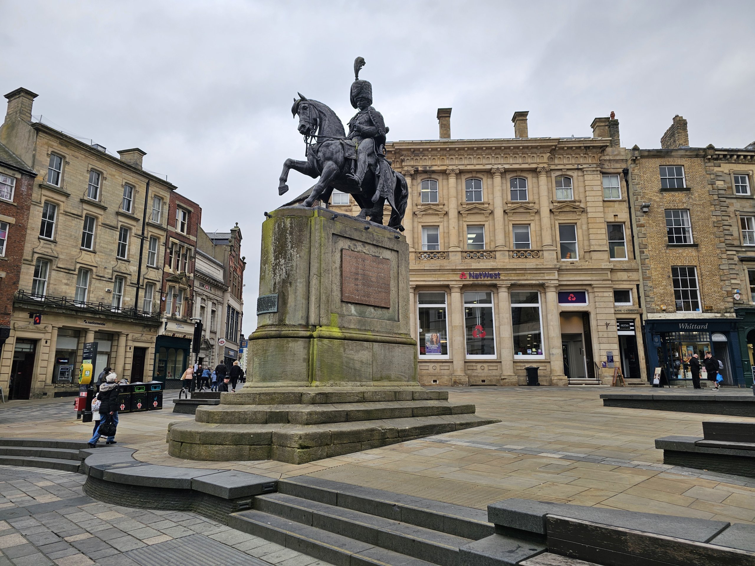 Torget domineres av St Nicholas-kirken fra 1800-tallet og den store rytterstatuen av 3. Charles William Vane Stewart, markise av Londonderry.