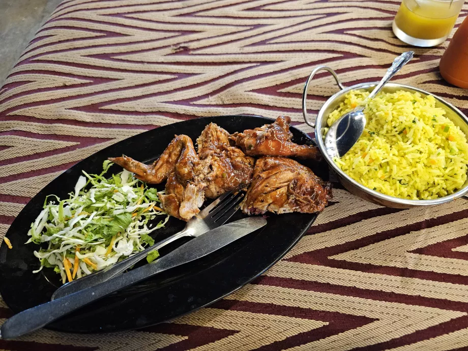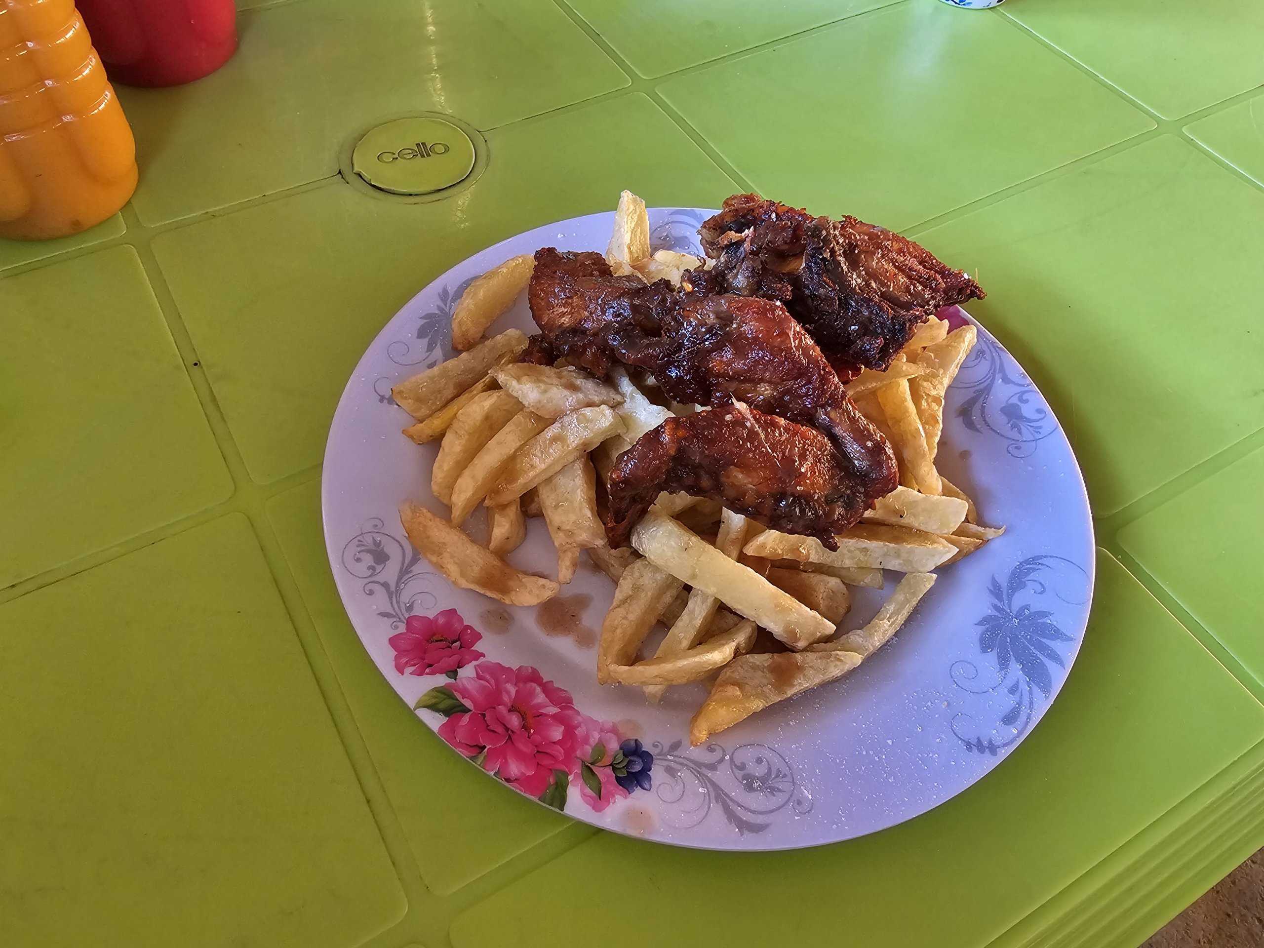 - på menyen med pommes frites / poteter, salat, eventuelt stekt banan rundt 7 000 tzs til 10 000 tzs