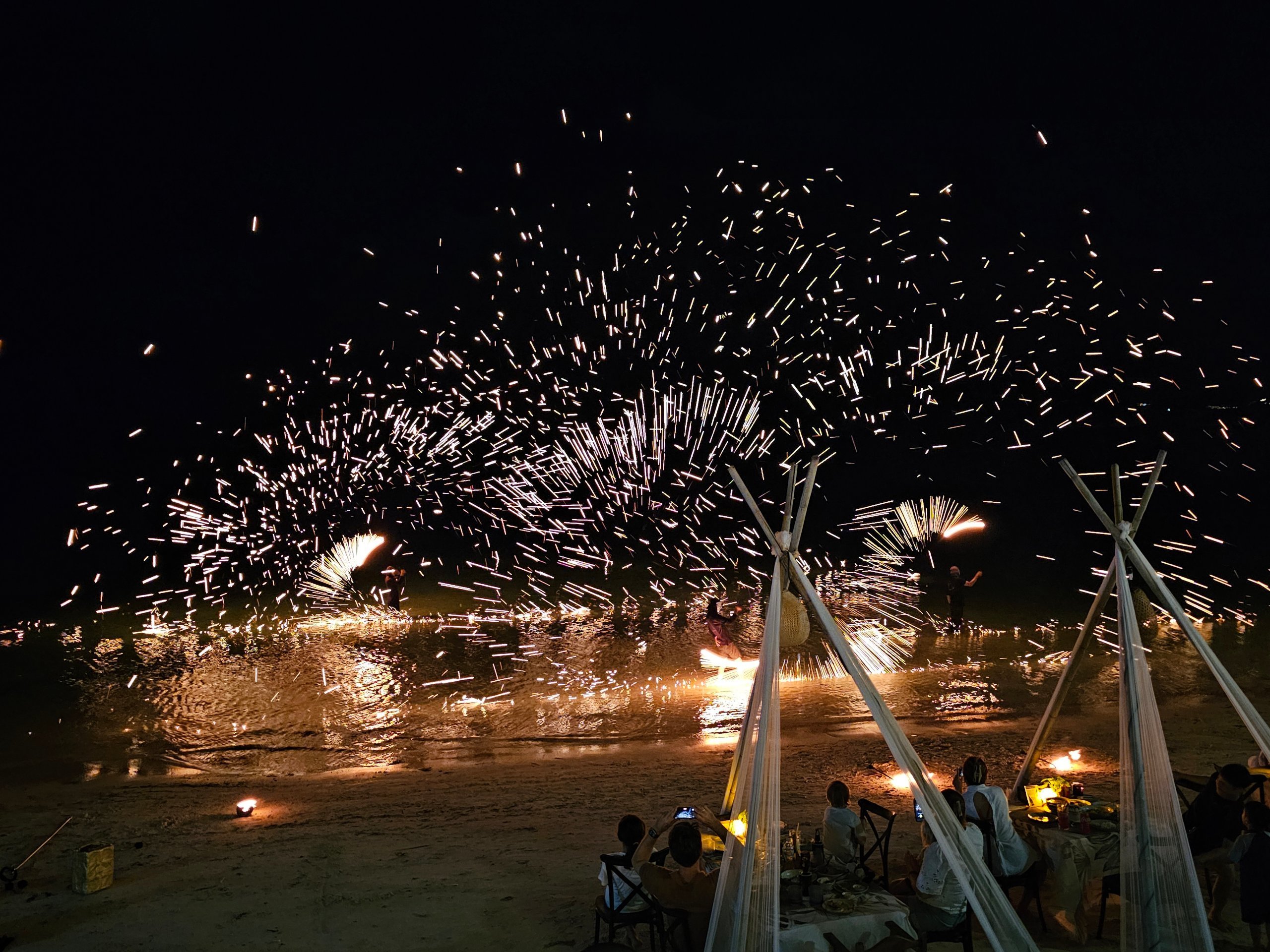 Om kvelden er det ofte ildshow rett på stranden, spesielt i det sentrale området. Atmosfæren er avslappet og uformell - mer som en barfotfest i sanden enn en formell klubbkveld.